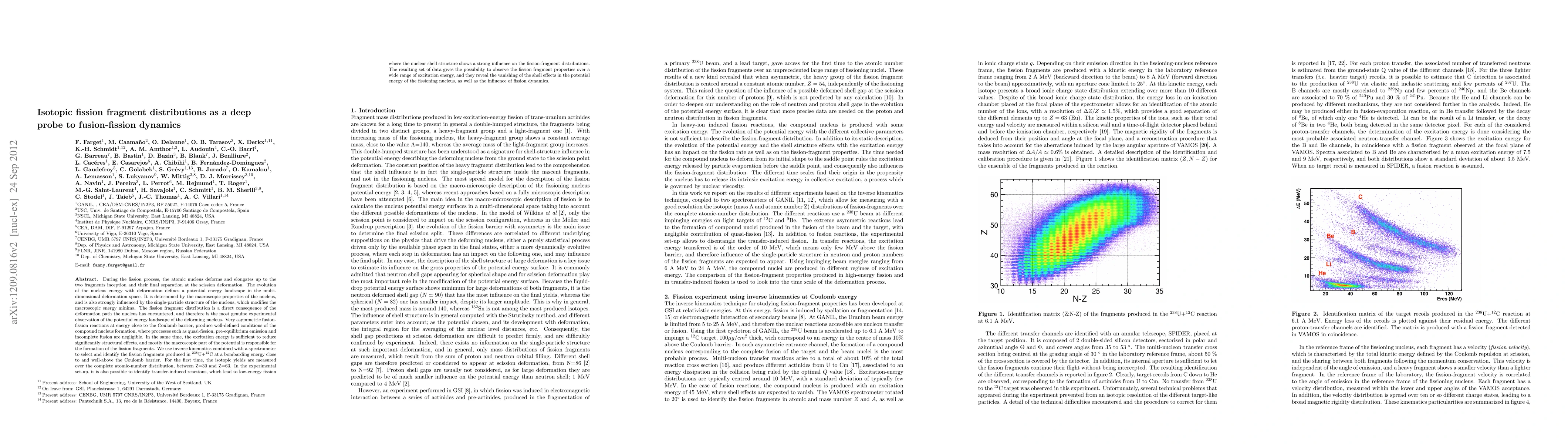 During the fission process, the nucleus deforms and elongates up to the two fragments inception and their final separation at scission deformation. The evolution of the nucleus energy with deformation is determined by the macroscopic properties of the nucleus, and is also strongly influenced by the single-particle structure of the nucleus. The fission fragment distribution is a direct consequence of the deformation path the nucleus has encountered, and therefore is the most genuine experimental observation of the potential energy landscape of the deforming nucleus. Very asymmetric fusion-fission reactions at energy close to the Coulomb barrier, produce well-defined conditions of the compound nucleus formation, where processes such as quasi-fission, pre-equilibrium emission and incomplete fusion are negligible. In the same time, the excitation energy is sufficient to reduce significantly structural effects, and mostly the macroscopic part of the potential is responsible for the formation of the fission fragments. We use inverse kinematics combined with spectrometers to select and identify the fission fragments produced in $^{238}$U+$^{12}$C at a bombarding energy close to and well-above the Coulomb barrier. For the first time, the isotopic yields are measured over the complete atomic-number distribution, between Z=30 and Z=63. The experimental set-up also allows to identify transfer-induced reactions, which lead to low-energy fission where the nuclear shell structure shows a strong influence on the fission-fragment distributions. The resulting set of data gives the possibility to observe the fission fragment properties over a wide range of excitation energy, and they reveal the vanishing of the shell effects in the potential energy of the fissioning nucleus, as well as the influence of fission dynamics.