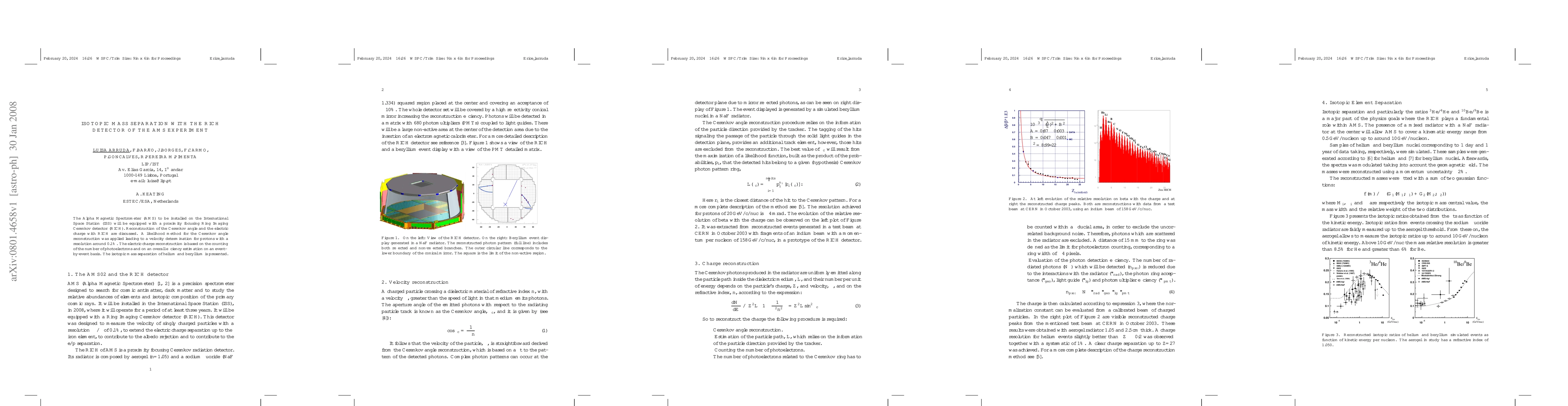 The RICH detector in the AMS Experiment achieved isotopic mass separation of helium and beryllium with a resolution of 0.1%. It successfully reconstructed the Cerenkov angle and electric charge using a likelihood method.