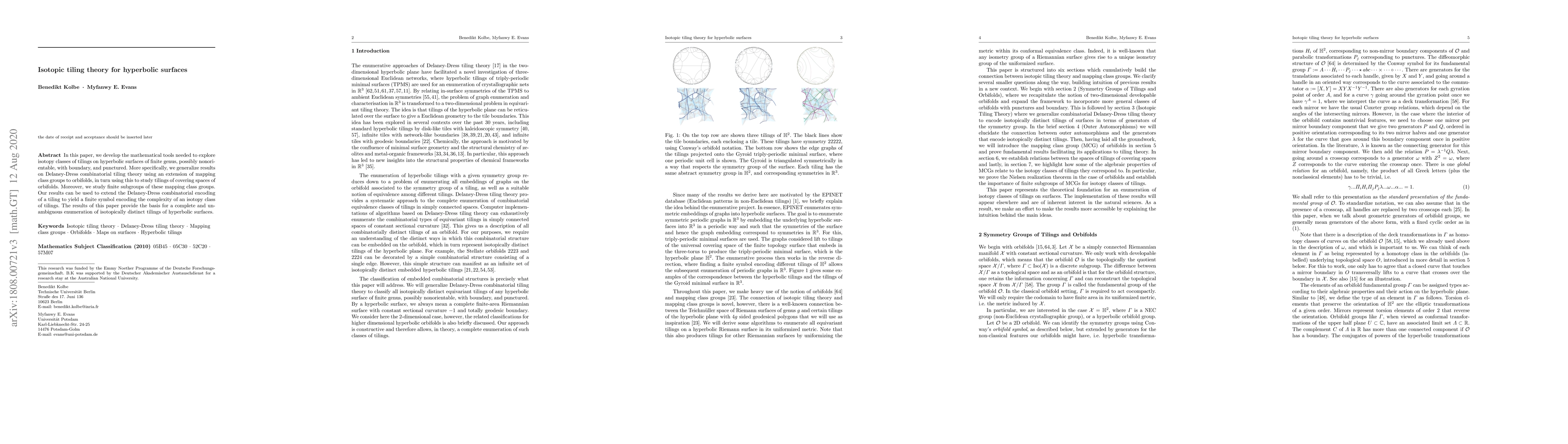 This paper develops mathematical tools to classify tilings on hyperbolic surfaces, extending Delaney-Dress theory through mapping class groups and orbifolds. It provides a finite symbol encoding for the complexity of isotopy classes of tilings, enabling complete and unambiguous enumeration.