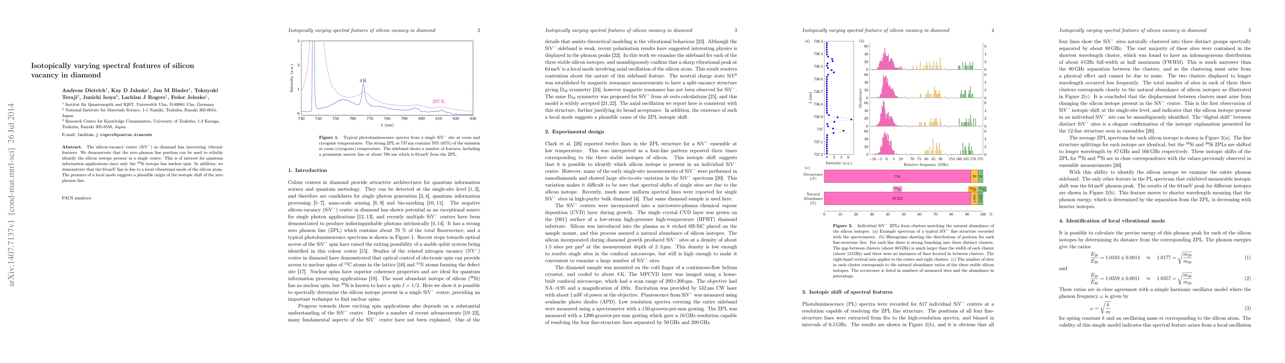 The silicon-vacancy centre (SiV) in diamond has interesting vibronic features. We demonstrate that the zero phonon line position can be used to reliably identify the silicon isotope present in a single centre. This is of interest for quantum information applications since only the silicon 29 isotope has nuclear spin. In addition, we demonstrate that the 64 meV line is due to a local vibrational mode of the silicon atom. The presence of a local mode suggests a plausible origin of the isotopic shift of the zero phonon line.