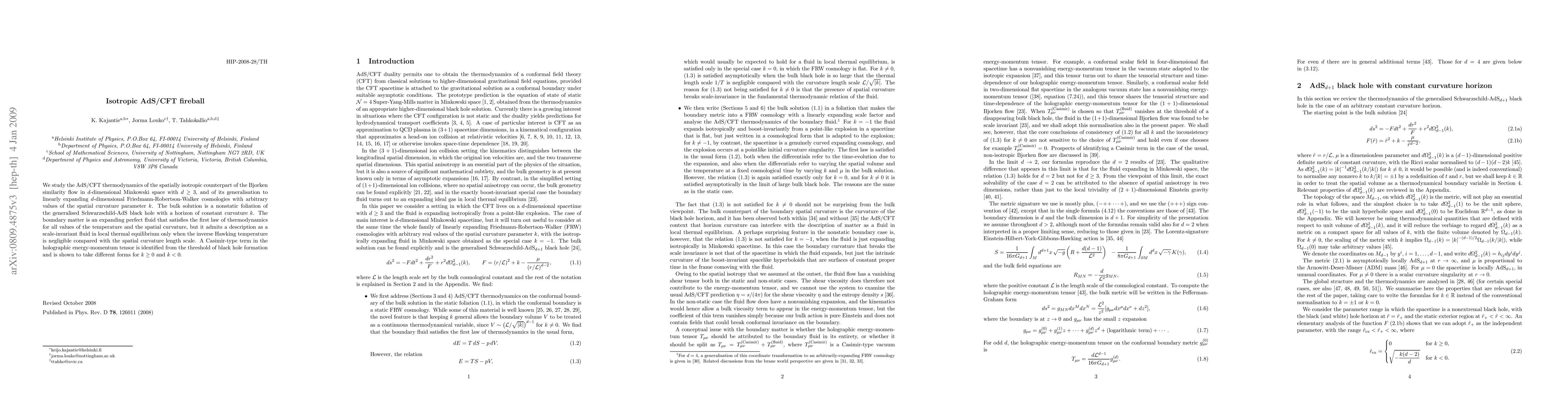 We study the AdS/CFT thermodynamics of the spatially isotropic counterpart of the Bjorken similarity flow in d-dimensional Minkowski space with d>=3, and of its generalisation to linearly expanding d-dimensional Friedmann-Robertson-Walker cosmologies with arbitrary values of the spatial curvature parameter k. The bulk solution is a nonstatic foliation of the generalised Schwarzschild-AdS black hole with a horizon of constant curvature k. The boundary matter is an expanding perfect fluid that satisfies the first law of thermodynamics for all values of the temperature and the spatial curvature, but it admits a description as a scale-invariant fluid in local thermal equilibrium only when the inverse Hawking temperature is negligible compared with the spatial curvature length scale. A Casimir-type term in the holographic energy-momentum tensor is identified from the threshold of black hole formation and is shown to take different forms for k>=0 and k<0.