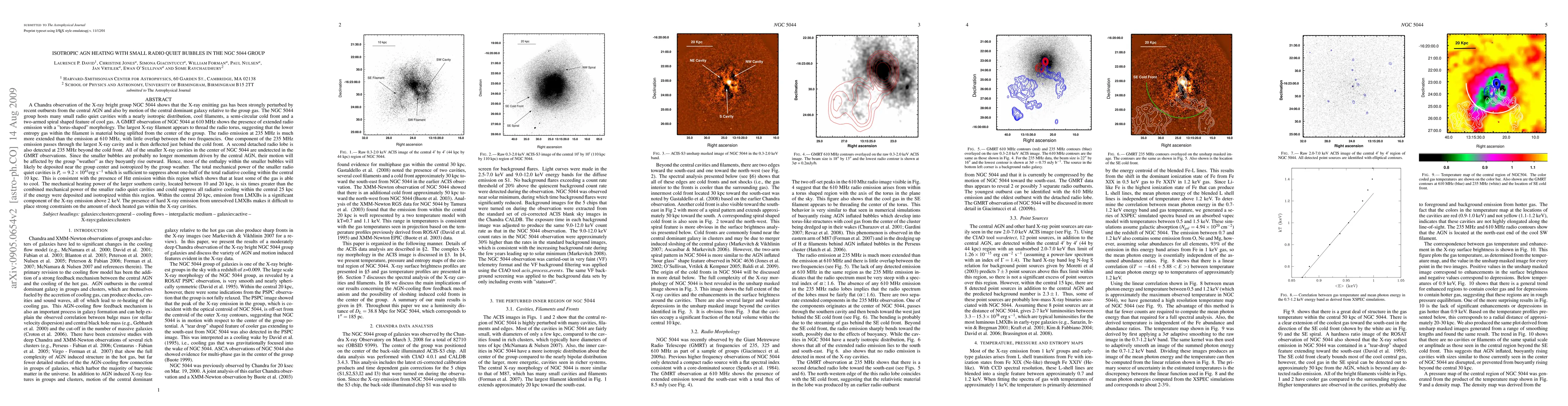 (abridged) A Chandra observation of the X-ray bright group NGC 5044 shows that the X-ray emitting gas has been strongly perturbed by recent outbursts from the central AGN and also by motion of the central dominant galaxy relative to the group gas. The NGC 5044 group hosts many small radio quiet cavities with a nearly isotropic distribution, cool filaments, a semi-circular cold front and a two-armed spiral shaped feature of cool gas. A GMRT observation of NGC 5044 at 610 MHz shows the presence of extended radio emission with a "torus-shaped" morphology. The largest X-ray filament appears to thread the radio torus, suggesting that the lower entropy gas within the filament is material being uplifted from the center of the group. The radio emission at 235 MHz is much more extended than the emission at 610 MHz, with little overlap between the two frequencies. One component of the 235 MHz emission passes through the largest X-ray cavity and is then deflected just behind the cold front. A second detached radio lobe is also detected at 235 MHz beyond the cold front. All of the smaller X-ray cavities in the center of NGC 5044 are undetected in the GMRT observations. Since the smaller bubbles are probably no longer momentum driven by the central AGN, their motion will be affected by the group "weather" as they buoyantly rise outward. Hence, most of the enthalpy within the smaller bubbles will likely be deposited near the group center and isotropized by the group weather. The total mechanical power of the smaller radio quiet cavities is $P_c = 9.2 \times 10^{41}$erg s$^{-1}$ which is sufficient to suppress about one-half of the total radiative cooling within the central 10 kpc. This is consistent with the presence of H$\alpha$ emission within this region which shows that at least some of the gas is able to cool.