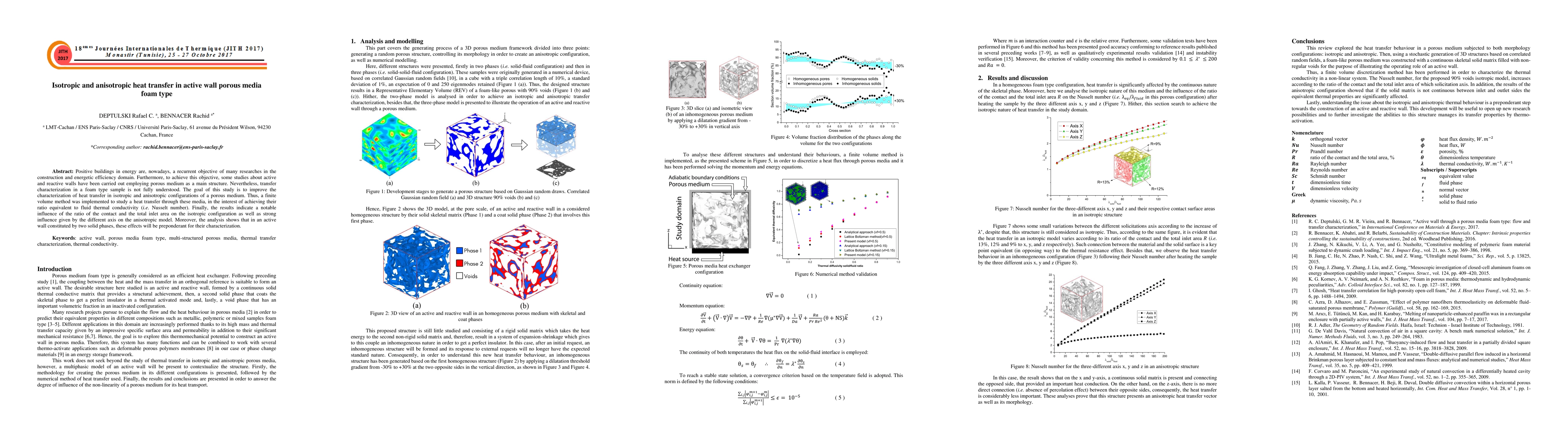 Positive buildings in energy are, nowadays, a recurrent objective of many researches in the construction and energetic efficiency domain. Furthermore, to achieve this objective, some studies about active and reactive walls have been carried out employing porous medium as a main structure. Nevertheless, transfer characterization in a foam type sample is not fully understood. The goal of this study is to improve the characterization of heat transfer in isotropic and anisotropic configurations of a porous medium. Thus, a finite volume method was implemented to study a heat transfer through these media, in the interest of achieving their ratio equivalent to fluid thermal conductivity (i.e. Nusselt number). Finally, the results indicate a notable influence of the ratio of the contact and the total inlet area on the isotropic configuration as well as strong influence given by the different axis on the anisotropic model. Moreover, the analysis shows that in an active wall constituted by two solid phases, these effects will be preponderant for their characterization.
