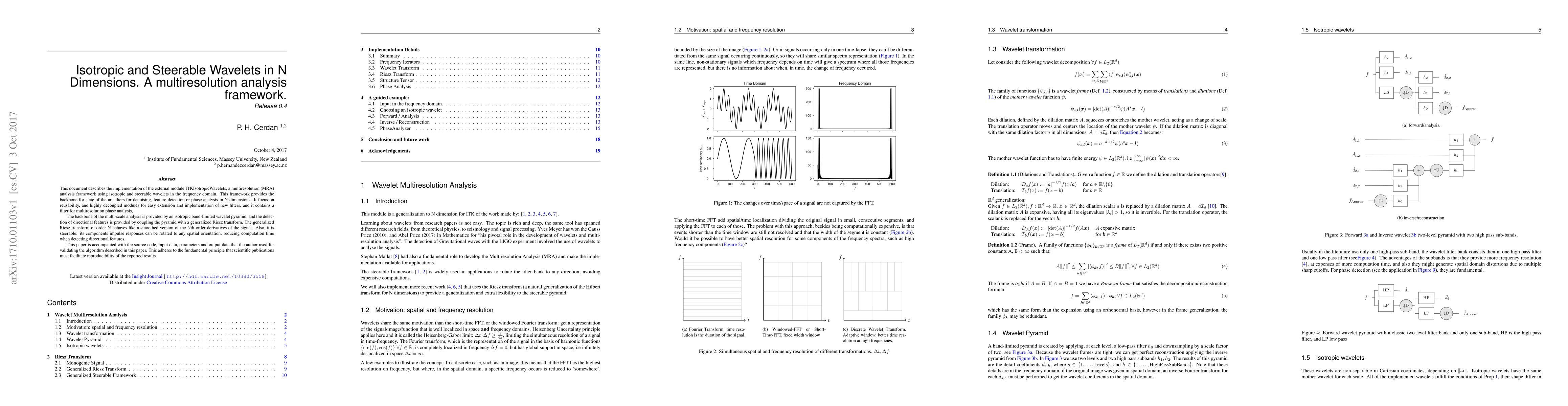 This document describes the implementation of the external module ITKIsotropicWavelets, a multiresolution (MRA) analysis framework using isotropic and steerable wavelets in the frequency domain. This framework provides the backbone for state of the art filters for denoising, feature detection or phase analysis in N-dimensions. It focus on reusability, and highly decoupled modules for easy extension and implementation of new filters, and it contains a filter for multiresolution phase analysis, The backbone of the multi-scale analysis is provided by an isotropic band-limited wavelet pyramid, and the detection of directional features is provided by coupling the pyramid with a generalized Riesz transform. The generalized Riesz transform of order N behaves like a smoothed version of the Nth order derivatives of the signal. Also, it is steerable: its components impulse responses can be rotated to any spatial orientation, reducing computation time when detecting directional features.
