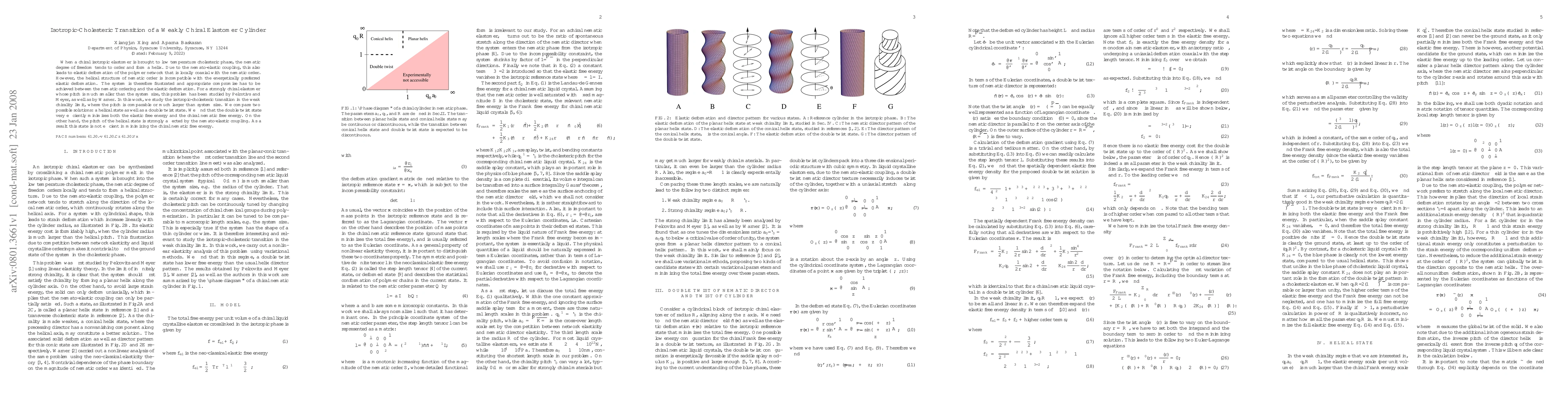 This paper investigates the isotropic-cholesteric transition in weakly chiral elastomers, focusing on the balance between nematic ordering and elastic deformation. It finds that a double twist state efficiently minimizes both elastic and chiral nematic free energies, while a helical state is less efficient due to strong nemato-elastic coupling effects.