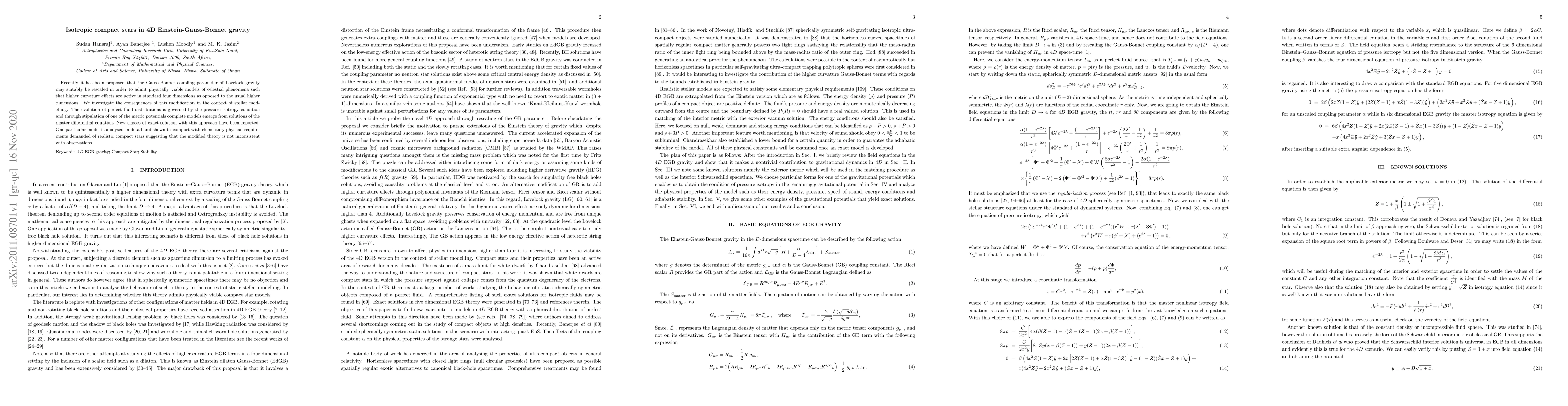 Recently it has been proposed that the Gauss-Bonnet coupling parameter of Lovelock gravity may suitably be rescaled in order to admit physically viable models of celestial phenomena such that higher curvature effects are active in standard four dimensions as opposed to the usual higher dimensions. We investigate the consequences of this modification in the context of stellar modelling. The evolution of perfect fluid distributions is governed by the pressure isotropy condition and through stipulation of one of the metric potentials complete models emerge from solutions of the master differential equation. New classes of exact solution with this approach have been reported. One particular model is analysed in detail and shown to comport with elementary physical requirements demanded of realistic compact stars suggesting that the modified theory is not inconsistent with observations.