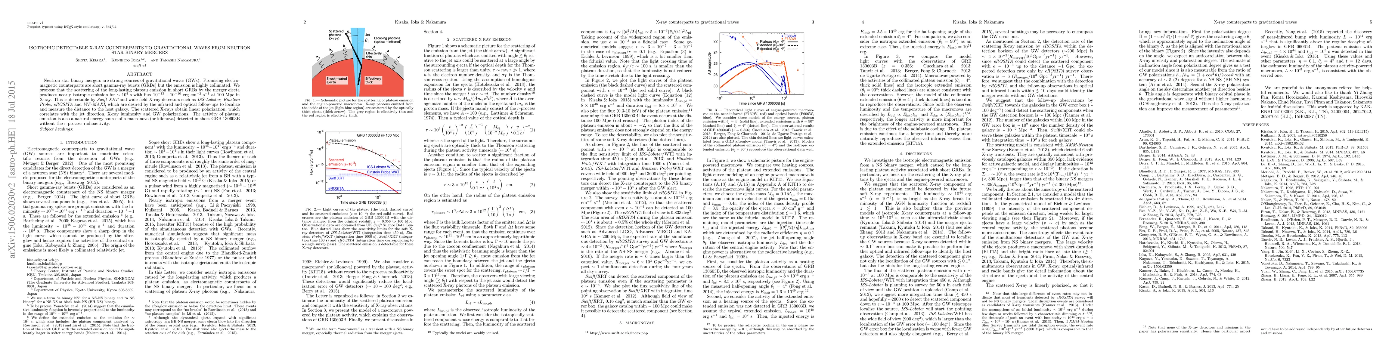 Neutron star binary mergers are strong sources of gravitational waves (GWs). Promising electromagnetic counterparts are short gamma-ray bursts (GRBs) but the emission is highly collimated. We propose that the scattering of the long-lasting plateau emission in short GRBs by the merger ejecta produces nearly isotropic emission for $\sim 10^4$ s with flux $10^{-13}-10^{-10}$ erg cm$^{-2}$ s$^{-1}$ at 100 Mpc in X-ray. This is detectable by Swift XRT and wide field X-ray detectors such as ISS-Lobster, Einstein Probe, eROSITA and WF-MAXI, which are desired by the infrared and optical follow-ups to localize and measure the distance to the host galaxy. The scattered X-rays obtain linear polarization, which correlates with the jet direction, X-ray luminosity and GW polarizations. The activity of plateau emission is also a natural energy source of a macronova (or kilonova) detected in short GRB 130603B without the $r$-process radioactivity.