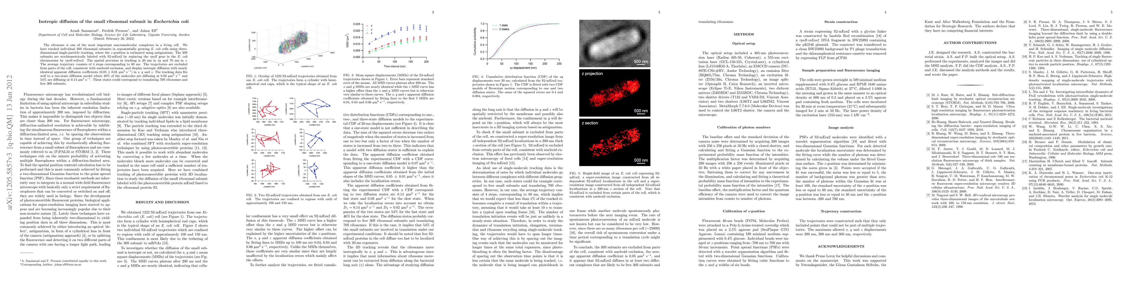 This study uses three-dimensional single-particle tracking to observe the diffusion of 30S ribosomal subunits in E. coli, revealing isotropic diffusion with apparent coefficients of 0.05 +/- 0.01 um^2/s, and fitting well to a two-state diffusion model. The findings suggest distinct diffusion rates corresponding to translating ribosomes and free subunits.
