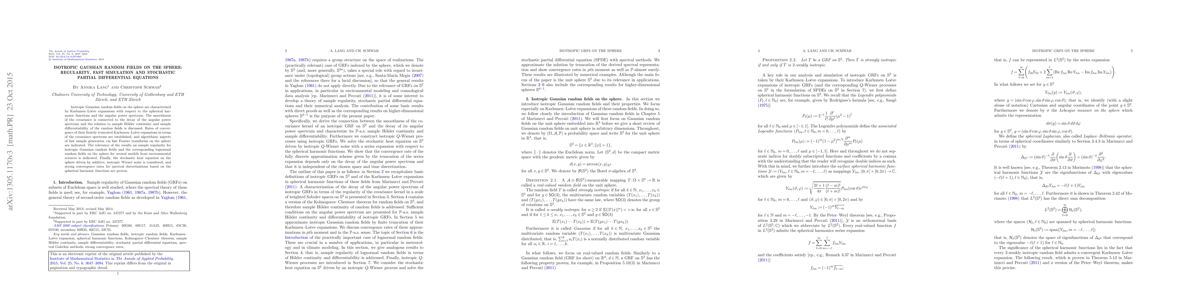 This paper characterizes isotropic Gaussian random fields on the sphere using Karhunen-Loève expansions and discusses their sample regularity and fast simulation methods. It also proves strong convergence rates for stochastic partial differential equations driven by isotropic Wiener noise.