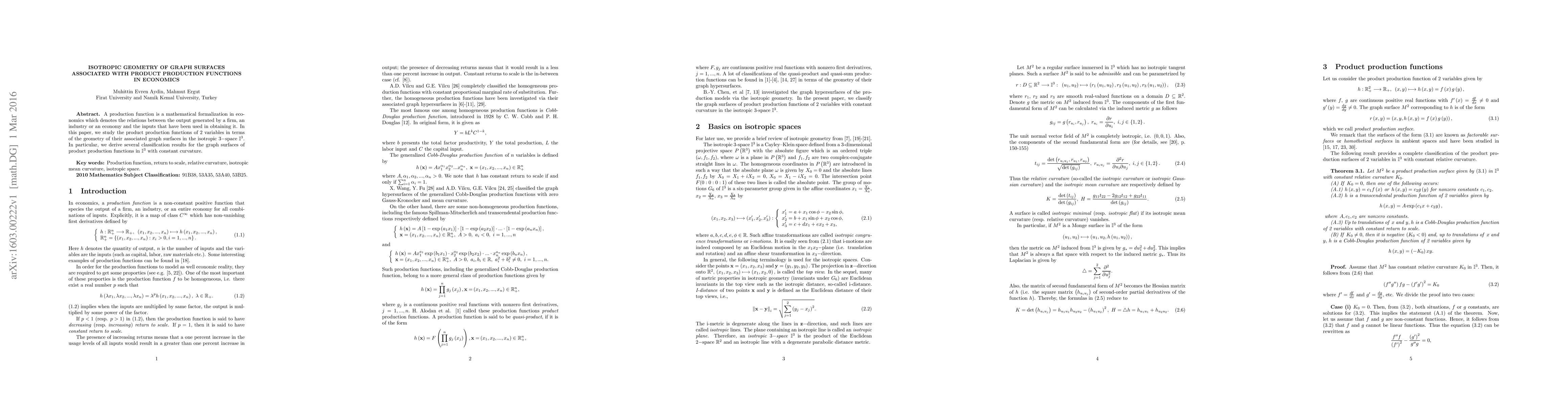 A production function is a mathematical formalization in economics which denotes the relations between the output generated by a firm, an industry or an economy and the inputs that have been used in obtaining it. In this paper, we study the product production functions of 2 variables in terms of the geometry of their associated graph surfaces in the isotropic 3-space I^{3}. In particular, we derive several classification results for the graph surfaces of product production functions in I^{3} with constant curvature.