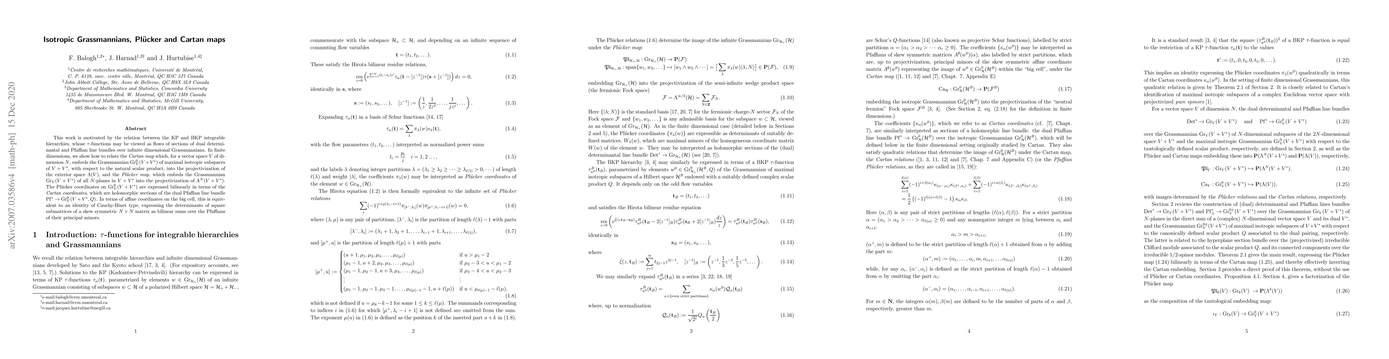This paper explores the connection between the Cartan and Plücker maps in the context of finite-dimensional Grassmannians of maximal isotropic subspaces, expressing Plücker coordinates in terms of Cartan coordinates through bilinear relations. It also relates these maps to the KP and BKP integrable hierarchies.