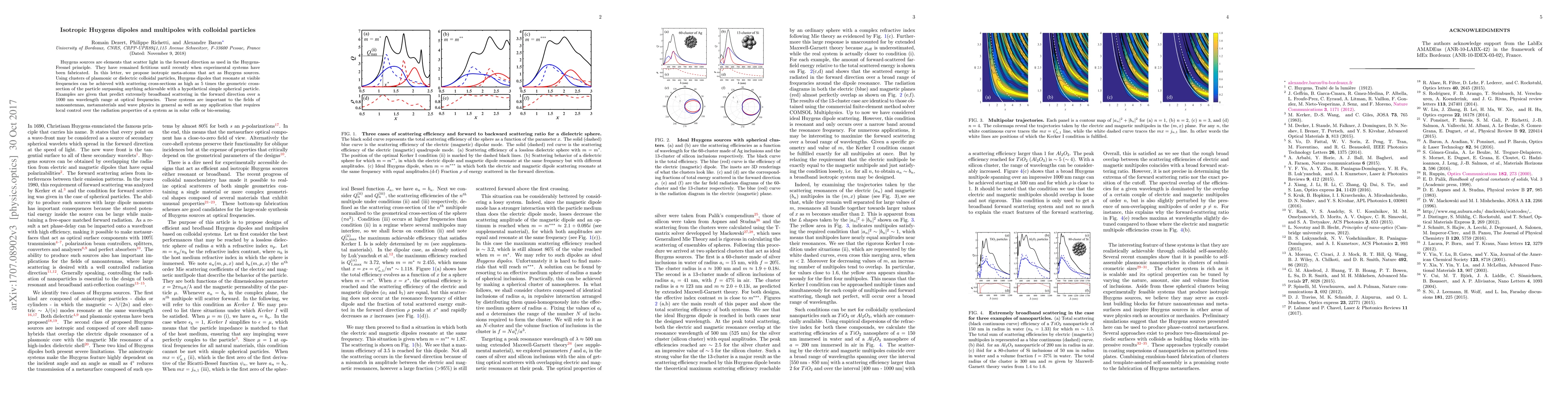 Huygens sources are elements that scatter light in the forward direction as used in the Huygens-Fresnel principle. They have remained fictitious until recently where experimental systems have been fabricated. In this letter, we propose isotropic meta-atoms that act as Huygens sources. Using clusters of plasmonic or dielectric colloidal particles, Huygens dipoles that resonate at visible frequencies can be achieved with scattering cross-sections as high as 5 times the geometric cross-section of the particle surpassing anything achievable with a hypothetical simple spherical particle. Examples are given that predict extremely broadband scattering in the forward direction over a 1000 nm wavelength range at optical frequencies. These systems are important to the fields of nanoantennas, metamaterials and wave physics in general as well as any application that requires local control over the radiation properties of a system as in solar cells or bio-sensing.