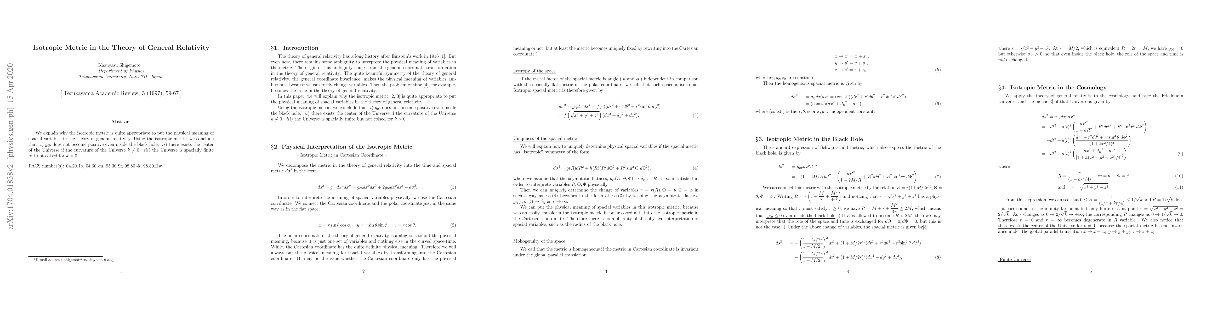 Two-line summary: This paper argues that the isotropic metric in general relativity effectively interprets spatial variables, demonstrating that g_{00} remains non-positive within black holes, posits the existence of a Universe center when curvature is non-zero, and concludes that a spatially finite but non-closed Universe exists for positive curvature.