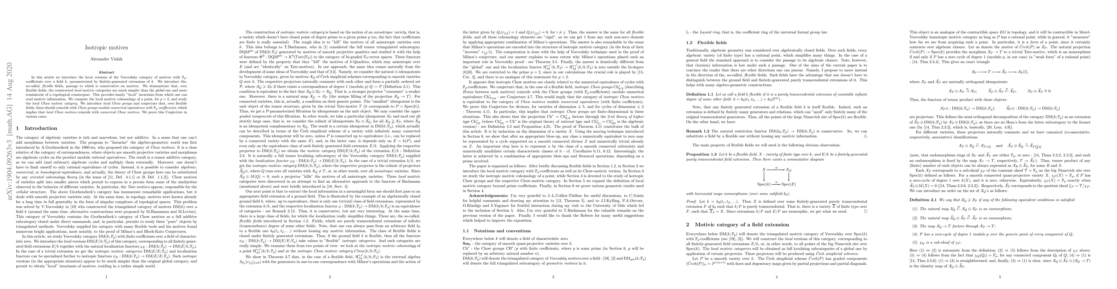 In this article we introduce the local versions of the Voevodsky category of motives with Z/p-coefficients over a field k, parameterized by finitely-generated extensions of k. We introduce the, so-called, flexible fields, passage to which is conservative on motives. We demonstrate that, over flexible fields, the constructed local motivic categories are much simpler than the global one and more reminiscent of a topological counterpart. This provides handy "local" invariants from which one can read motivic information. We compute the local motivic cohomology of a point, for p=2, and study the local Chow motivic category. We introduce local Chow groups and conjecture that, over flexible fields, these should coincide with Chow groups modulo numerical equivalence with Z/p-coefficients, which implies that local Chow motives coincide with numerical Chow motives. We prove this Conjecture in various cases.