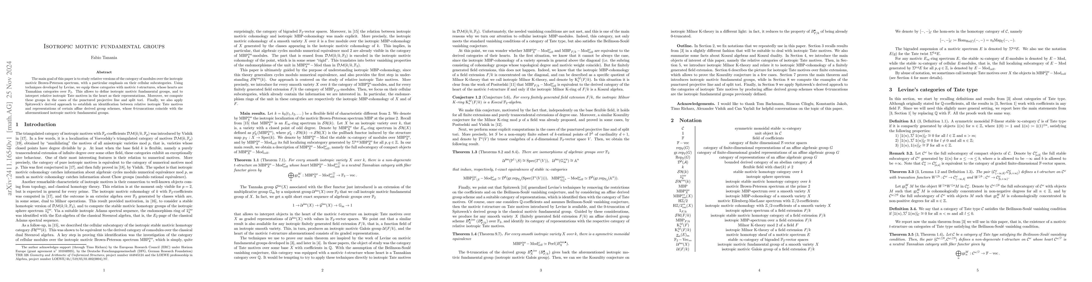 The main goal of this paper is to study relative versions of the category of modules over the isotropic motivic Brown-Peterson spectrum, with a particular emphasis on their cellular subcategories. Using techniques developed by Levine, we equip these categories with motivic $t$-structures, whose hearts are Tannakian categories over ${\mathbb F}_2$. This allows to define isotropic motivic fundamental groups, and to interpret relative isotropic Tate motives in the heart as their representations. Moreover, we compute these groups in the cases of the punctured projective line and split tori. Finally, we also apply Spitzweck's derived approach to establish an identification between relative isotropic Tate motives and representations of certain affine derived group schemes, whose 0-truncations coincide with the aforementioned isotropic motivic fundamental groups.