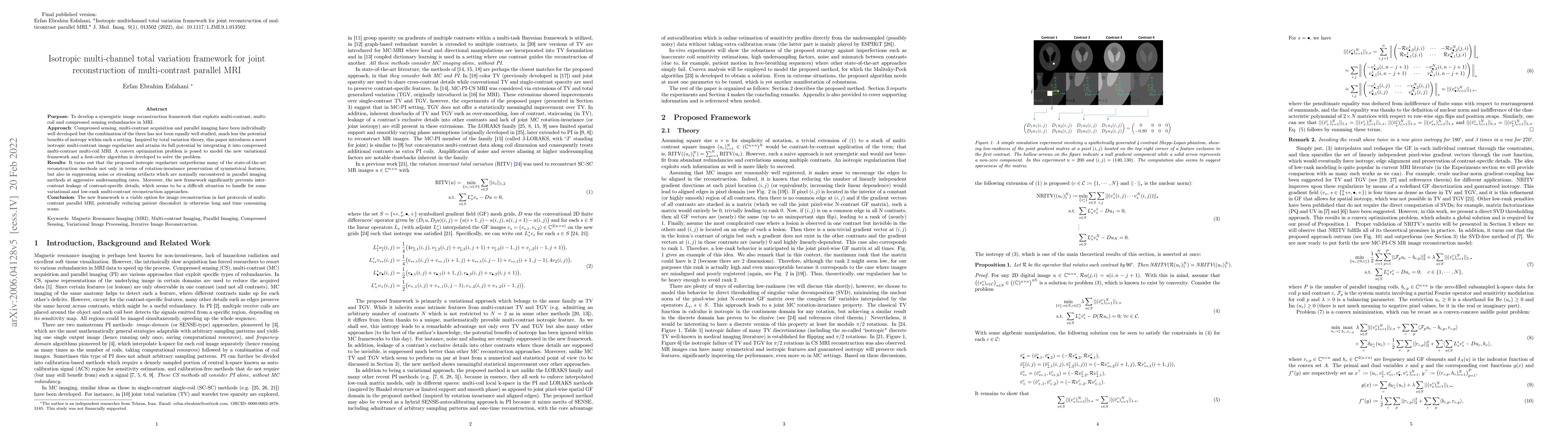 This paper develops an isotropic multichannel total variation framework for joint reconstruction of multicontrast parallel MRI, combining compressed sensing, multicoil, and multicontrast redundancies. The proposed method outperforms state-of-the-art techniques in preserving symmetrical features, suppressing artifacts, and preventing intercontrast leakage, offering a viable solution for faster MRI scans.