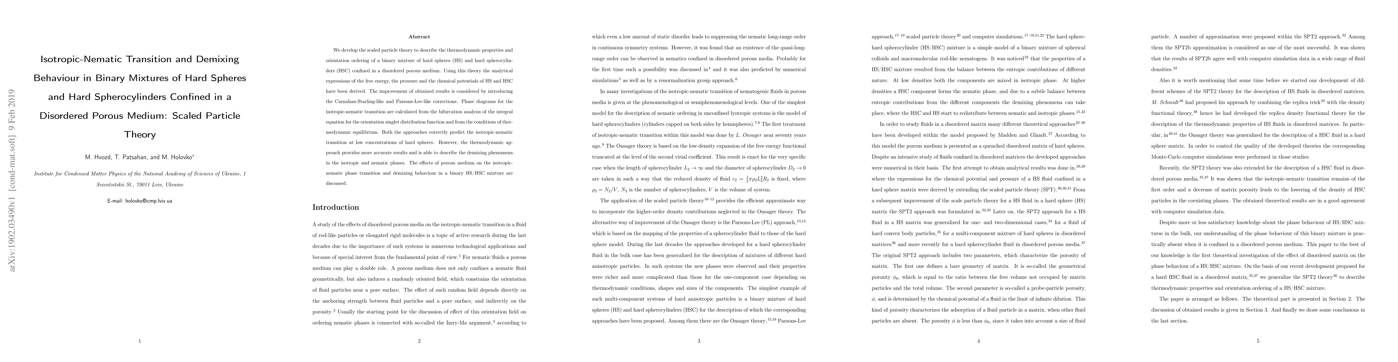 This paper develops scaled particle theory to analyze the thermodynamic properties and orientation ordering of a binary mixture of hard spheres and hard spherocylinders in a disordered porous medium. The study predicts the isotropic-nematic transition and demixing behavior, with the thermodynamic approach providing more accurate results and describing demixing phenomena.
