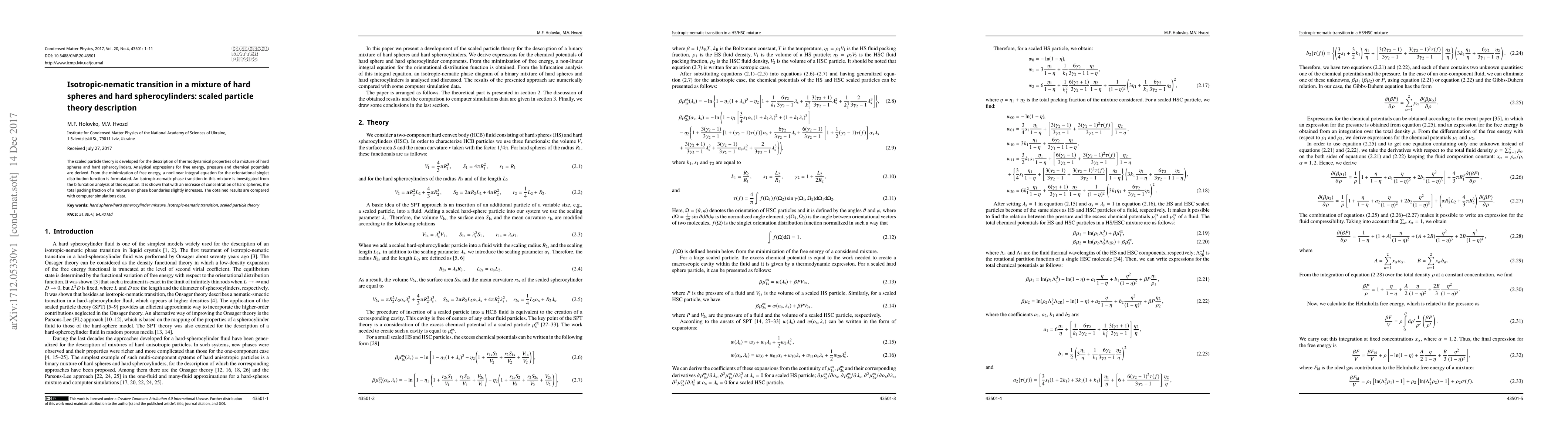 This paper develops scaled particle theory to describe thermodynamic properties of a hard sphere and hard spherocylinder mixture, deriving expressions for free energy and pressure. It identifies an isotropic-nematic phase transition via bifurcation analysis, showing that increasing hard sphere concentration slightly raises the mixture's total packing fraction on phase boundaries, corroborated by simulation data.