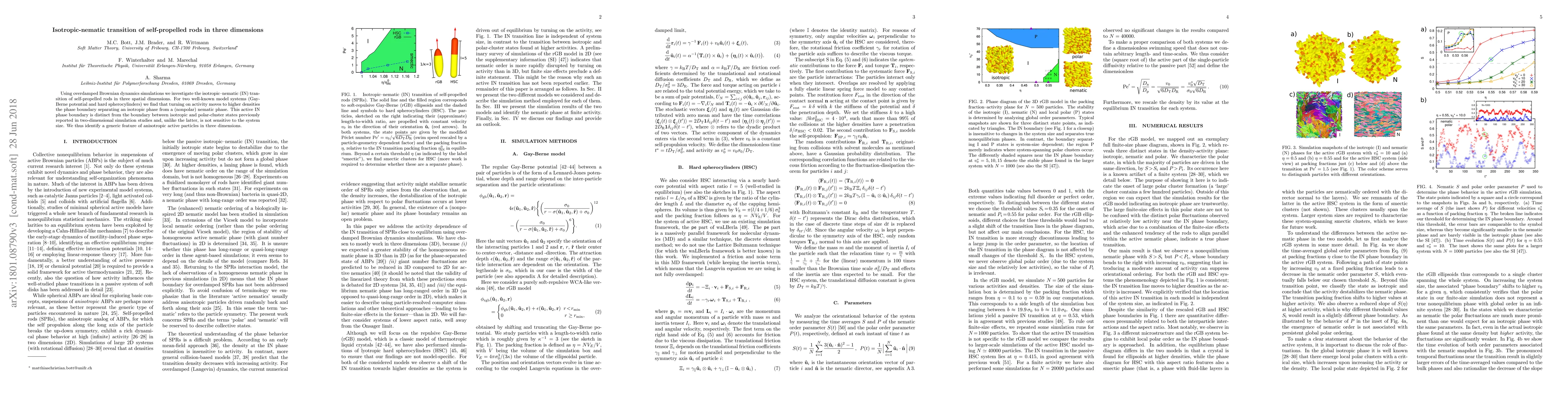 This paper explores the isotropic-nematic transition in three-dimensional self-propelled rods using simulations, revealing that activity shifts the IN phase boundary to higher densities. Unlike two-dimensional systems, this transition is system size-independent and identifies a generic feature of active anisotropic particles.