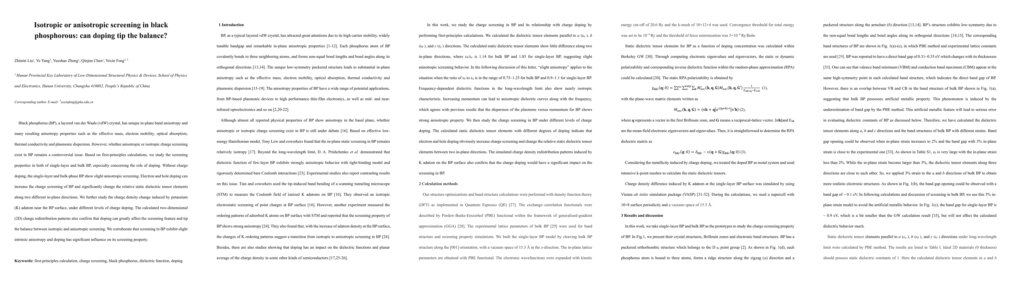 This paper investigates the charge screening properties of black phosphorus using first-principles calculations, revealing slight intrinsic anisotropy in both single-layer and bulk BP. Doping, particularly with potassium, significantly enhances charge screening and alters the dielectric tensor, tipping the balance between isotropic and anisotropic screening.