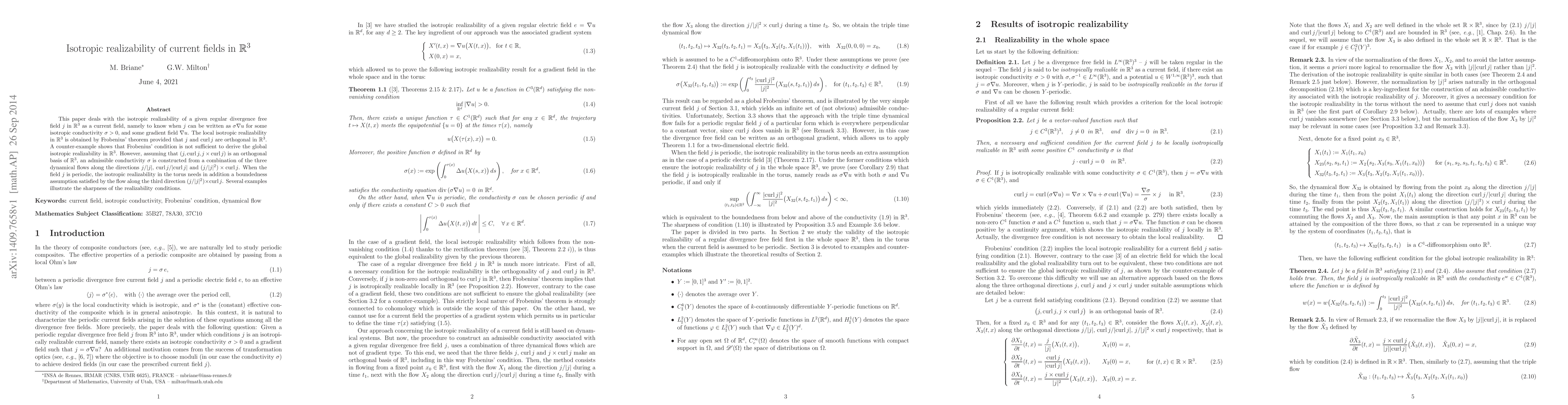 This paper deals with the isotropic realizability of a given regular divergence free field j in R^3 as a current field, namely to know when j can be written as sigma Du for some isotropic conductivity sigma, and some gradient field Du. The local isotropic realizability in R^3 is obtained by Frobenius' theorem provided that j and curl j are orthogonal in R^3. A counter-example shows that Frobenius' condition is not sufficient to derive the global isotropic realizability in R^3. However, assuming that (j, curl j, j x curl j) is an orthogonal basis of R^3, an admissible conductivity sigma is constructed from a combination of the three dynamical flows along the directions j/|j|, curl j/|curl j| and (j/|j|^2) x curl j. When the field j is periodic, the isotropic realizability in the torus needs in addition a boundedness assumption satisfied by the flow along the third direction (j/|j|^2) x \curl j. Several examples illustrate the sharpness of the realizability conditions.
