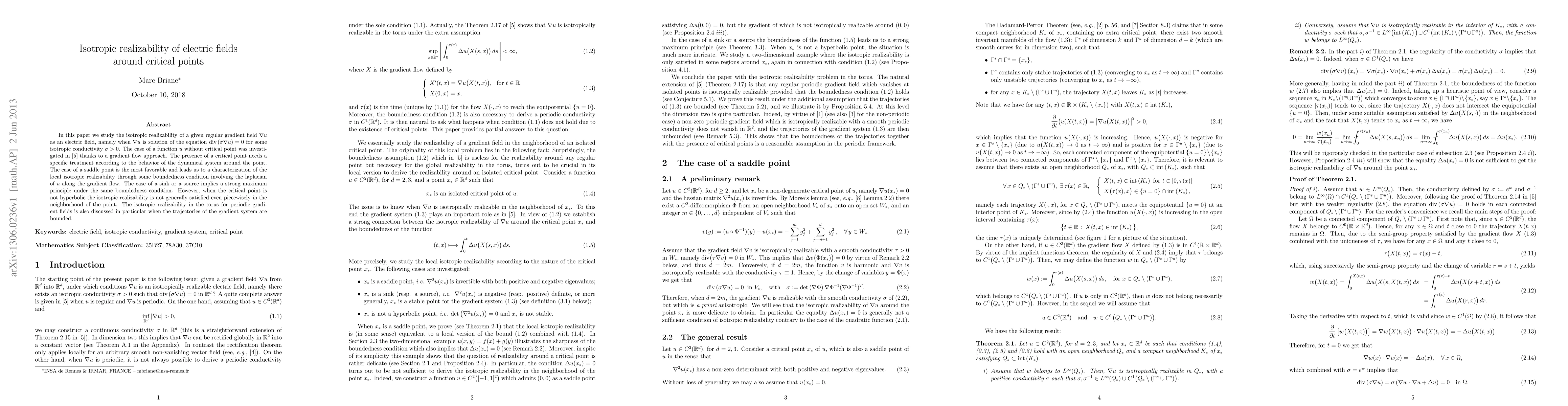 In this paper we study the isotropic realizability of a given regular gradient field $\nabla u$ as an electric field, namely when $\nabla u$ is solution of the equation $\div\left(\si\nabla u\right)=0$ for some isotropic conductivity $\si>0$. The case of a function $u$ without critical point was investigated in \cite{BMT} thanks to a gradient flow approach. The presence of a critical point needs a specific treatment according to the behavior of the dynamical system around the point. The case of a saddle point is the most favorable and leads us to a characterization of the local isotropic realizability through some boundedness condition involving the laplacian of $u$ along the gradient flow. The case of a sink or a source implies a strong maximum principle under the same boundedness condition. However, when the critical point is not hyperbolic the isotropic realizability is not generally satisfied even piecewisely in the neighborhood of the point. The isotropic realizability in the torus for periodic gradient fields is also discussed in particular when the trajectories of the gradient system are bounded.