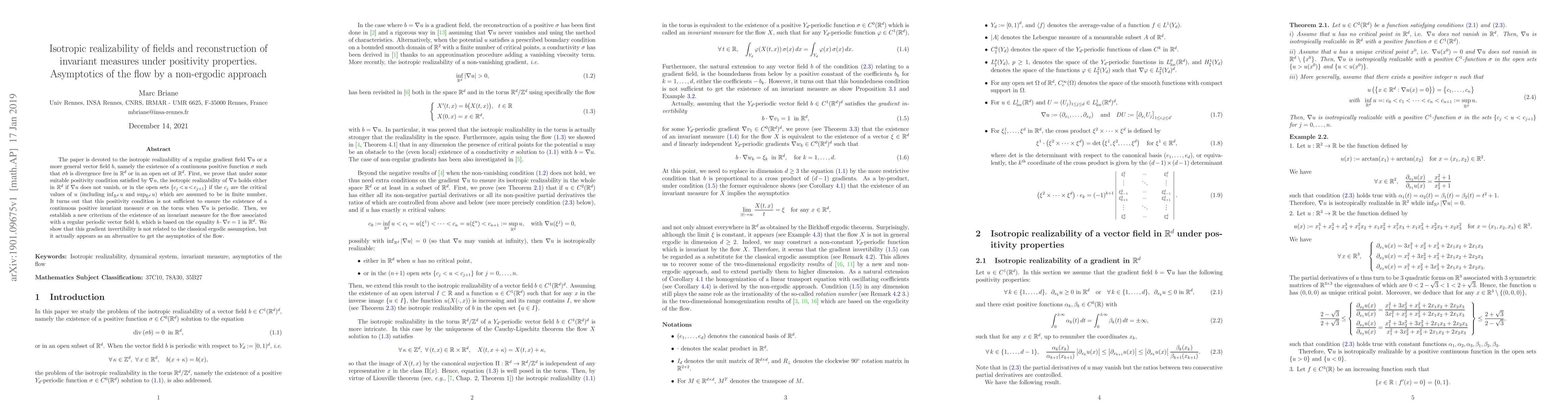 The paper is devoted to the isotropic realizability of a regular gradient field u or a more general vector field b, namely the existence of a continuous positive function $\sigma$ such that $\sigma$b is divergence free in R d or in an open set of R d. First, we prove that under some suitable positivity condition satisfied by u, the isotropic realizability of u holds either in R d if u does not vanish, or in the open sets {c j < u < c j+1 } if the c j are the critical values of u (including inf R d u and sup R d u) which are assumed to be in finite number. It turns out that this positivity condition is not sufficient to ensure the existence of a continuous positive invariant measure $\sigma$ on the torus when u is periodic. Then, we establish a new criterium of the existence of an invariant measure for the flow associated with a regular periodic vector field b, which is based on the equality b $\times$ v = 1 in R d. We show that this gradient invertibility is not related to the classical ergodic assumption, but it actually appears as an alternative to get the asymptotics of the flow.