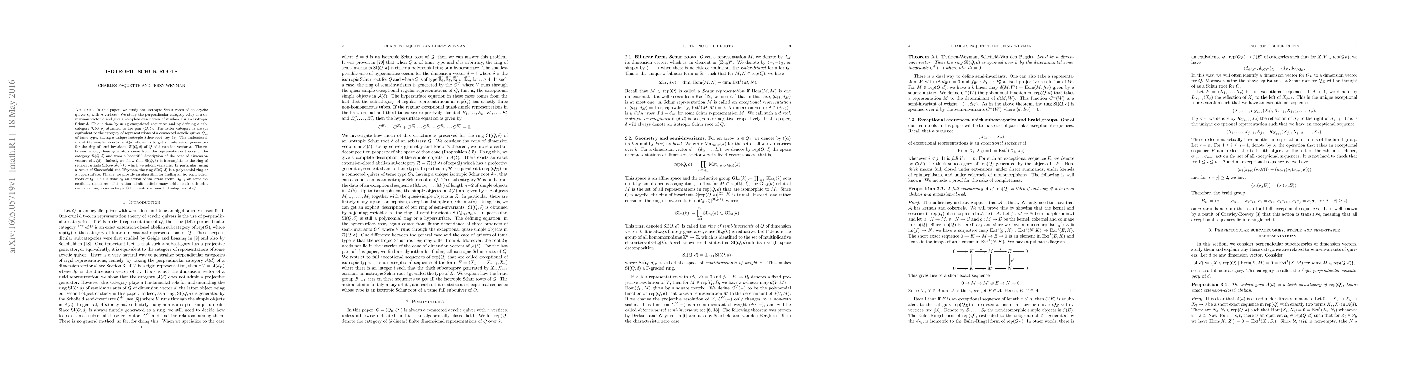 In this paper, we study the isotropic Schur roots of an acyclic quiver $Q$ with $n$ vertices. We study the perpendicular category $\mathcal{A}(d)$ of a dimension vector $d$ and give a complete description of it when $d$ is an isotropic Schur $\delta$. This is done by using exceptional sequences and by defining a subcategory $\mathcal{R}(Q,\delta)$ attached to the pair $(Q,\delta)$. The latter category is always equivalent to the category of representations of a connected acyclic quiver $Q_{\mathcal{R}}$ of tame type, having a unique isotropic Schur root, say $\delta_{\mathcal{R}}$. The understanding of the simple objects in $\mathcal{A}(\delta)$ allows us to get a finite set of generators for the ring of semi-invariants SI$(Q,\delta)$ of $Q$ of dimension vector $\delta$. The relations among these generators come from the representation theory of the category $\mathcal{R}(Q,\delta)$ and from a beautiful description of the cone of dimension vectors of $\mathcal{A}(\delta)$. Indeed, we show that SI$(Q,\delta)$ is isomorphic to the ring of semi-invariants SI$(Q_{\mathcal{R}},\delta_{\mathcal{R}})$ to which we adjoin variables. In particular, using a result of Skowro\'nski and Weyman, the ring SI$(Q,\delta)$ is a polynomial ring or a hypersurface. Finally, we provide an algorithm for finding all isotropic Schur roots of $Q$. This is done by an action of the braid group $B_{n-1}$ on some exceptional sequences. This action admits finitely many orbits, each such orbit corresponding to an isotropic Schur root of a tame full subquiver of $Q$.