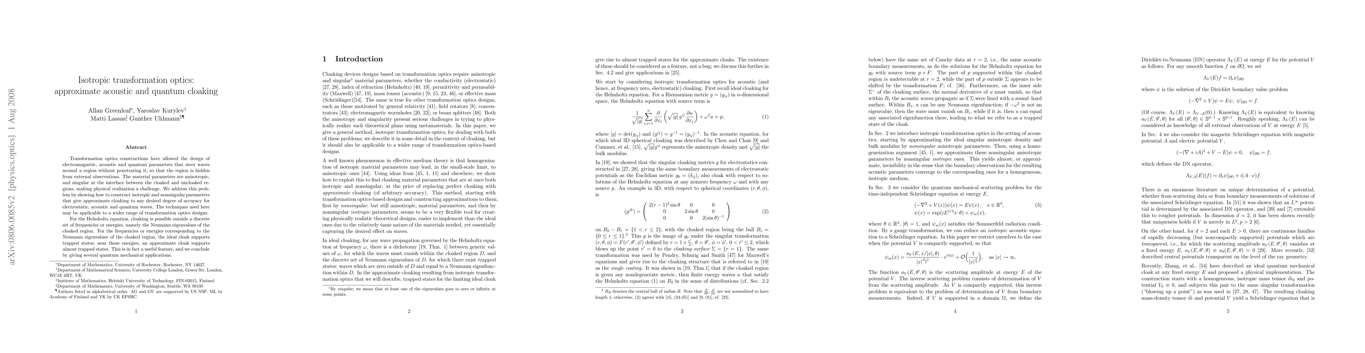 This paper presents a method for creating isotropic and nonsingular transformation optics parameters to achieve approximate cloaking for electromagnetic, acoustic, and quantum waves, addressing the challenges of anisotropic and singular material interfaces. It demonstrates that cloaking is feasible outside specific frequencies or energies, while near these, approximate cloaks support "almost trapped states," which has useful quantum mechanical applications.