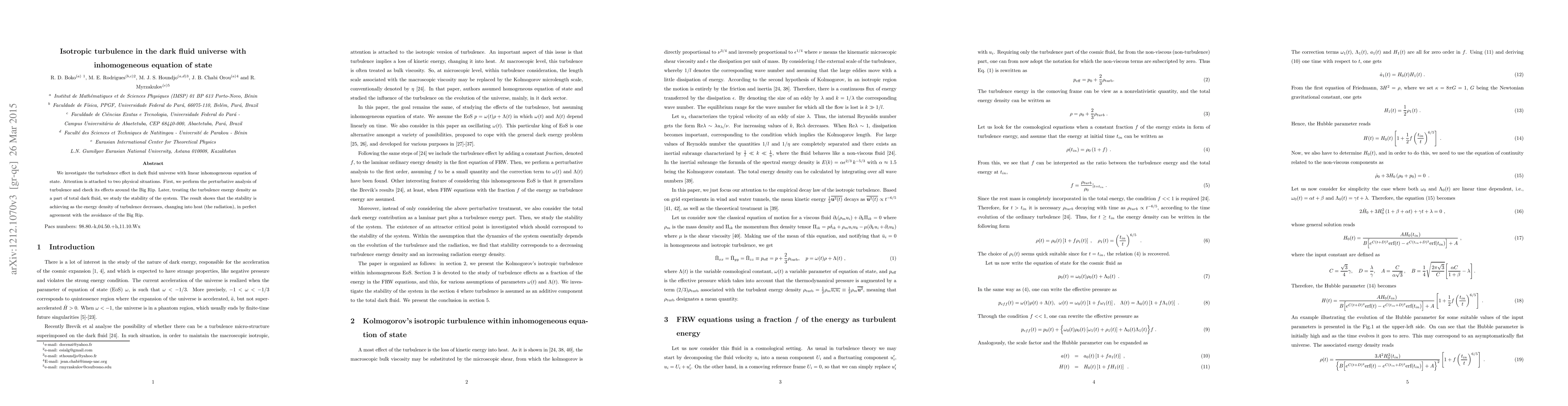 This paper examines turbulence in a dark fluid universe with an inhomogeneous equation of state, focusing on its effects near the Big Rip. It finds that turbulence stabilizes as its energy density diminishes, converting to heat, thereby averting the Big Rip scenario.