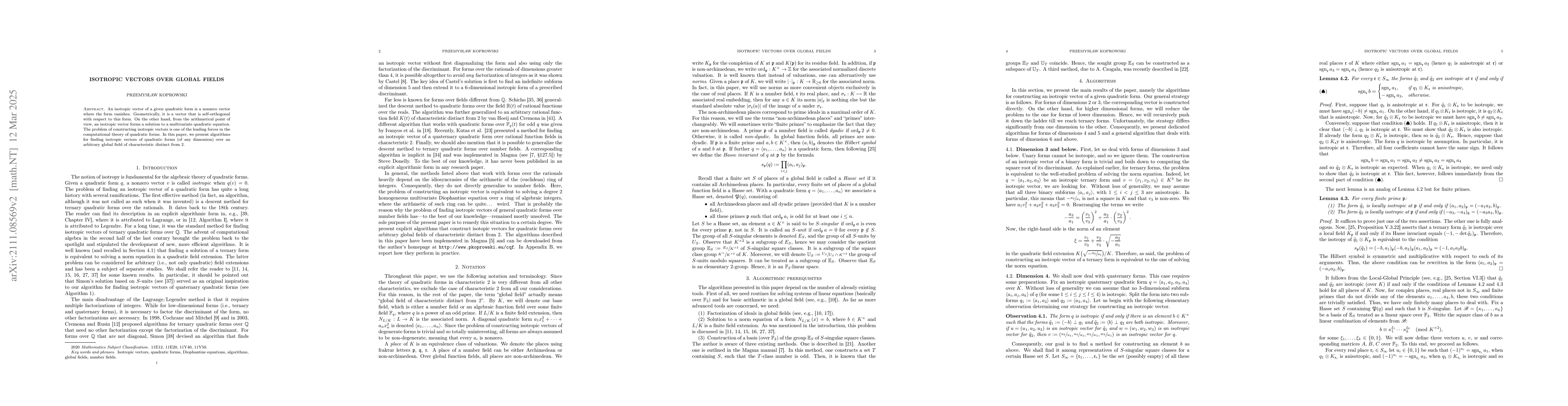 We present a complete suite of algorithms for finding isotropic vectors of quadratic forms (of any dimension) over an arbitrary global field of characteristic different from 2.