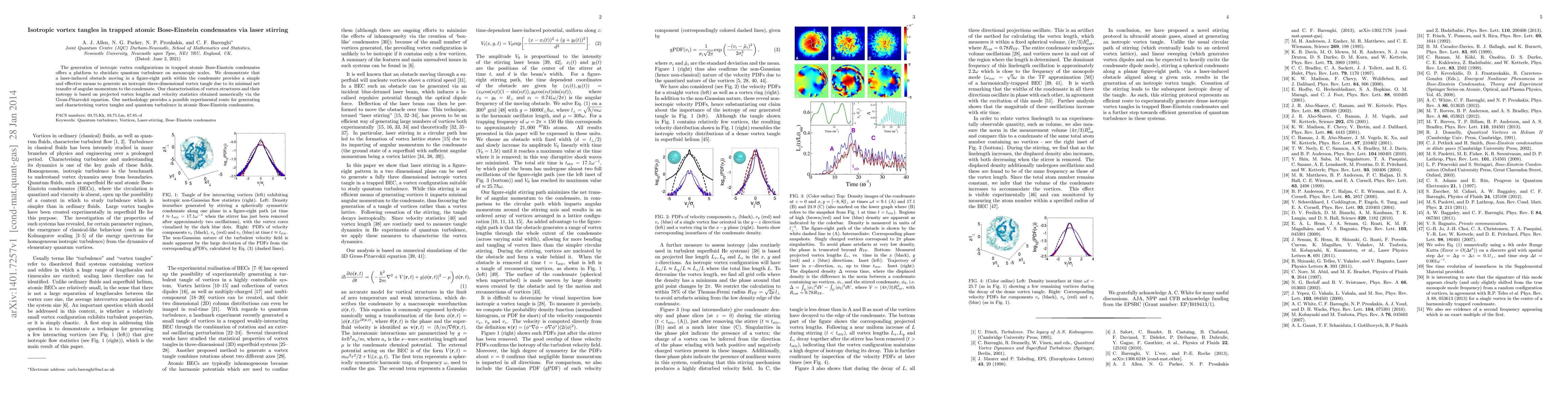This paper demonstrates a method to create isotropic vortex tangles in trapped atomic Bose-Einstein condensates using a laser-induced obstacle. The technique involves a figure-eight laser path to generate minimal net angular momentum transfer, facilitating the study of quantum turbulence through numerical characterization based on vortex length and velocity statistics.