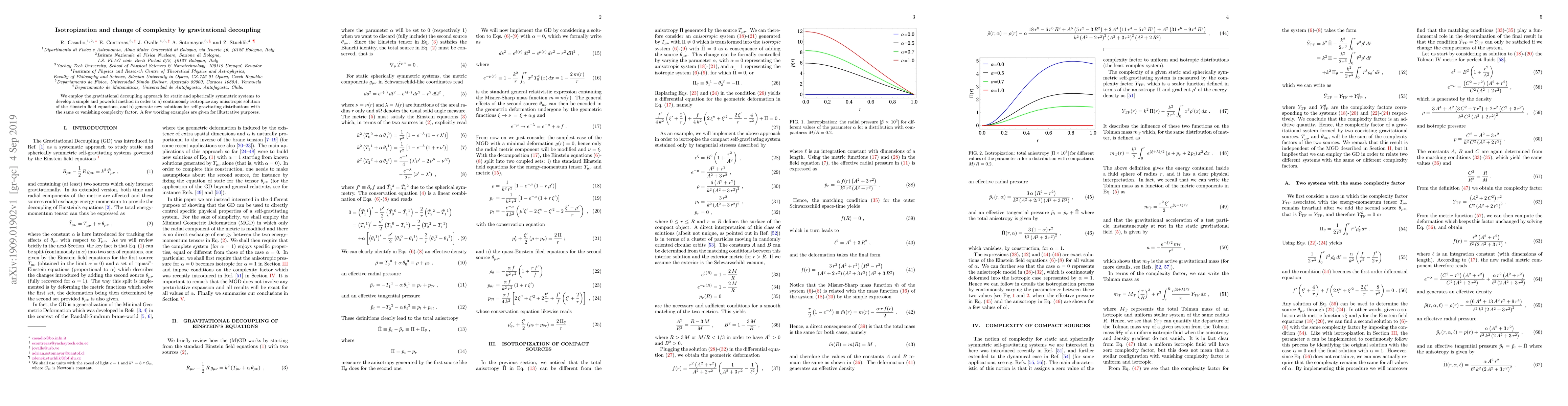 The research employs the gravitational decoupling (GD) approach for static and spherically symmetric systems to continuously isotropize anisotropic solutions of the Einstein field equations and generate new solutions with the same or vanishing complexity factor.