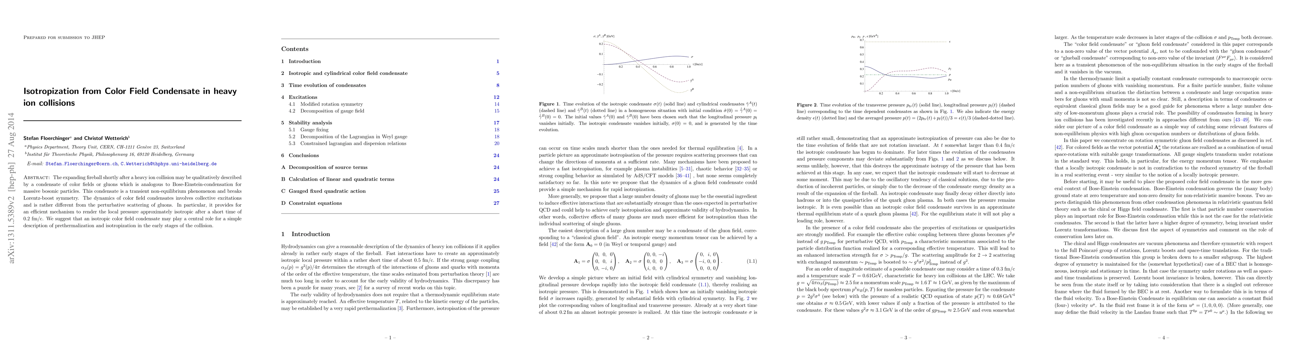 The expanding fireball shortly after a heavy ion collision may be qualitatively described by a condensate of color fields or gluons which is analogous to Bose-Einstein-condensation for massive bosonic particles. This condensate is a transient non-equilibrium phenomenon and breaks Lorentz-boost symmetry. The dynamics of color field condensates involves collective excitations and is rather different from the perturbative scattering of gluons. In particular, it provides for an efficient mechanism to render the local pressure approximately isotropic after a short time of 0.2 fm/c. We suggest that an isotropic color field condensate may play a central role for a simple description of prethermalization and isotropization in the early stages of the collision.