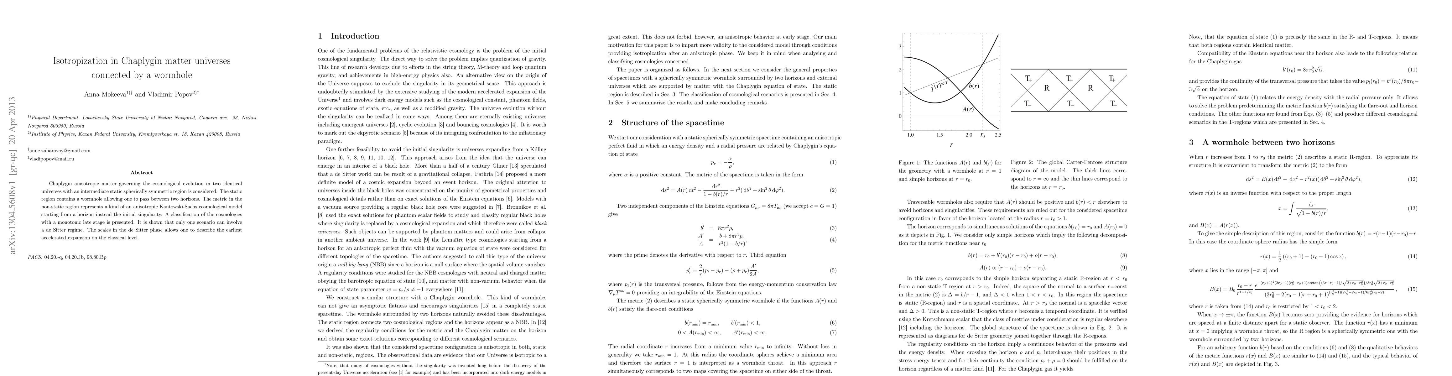Chaplygin anisotropic matter governing the cosmological evolution in two identical universes with an intermediate static spherically symmetric region is considered. The static region contains a wormhole allowing one to pass etween two horizons. The metric in the non-static region represents a kind of an anisotropic Kantowski-Sachs cosmological model starting from a horizon instead the initial singularity. A classification of the cosmologies with a monotonic late stage is presented. It is shown that only one scenario can involve a de Sitter regime. The scales in the de Sitter phase allows one to describe the earliest accelerated expansion on the classical level.