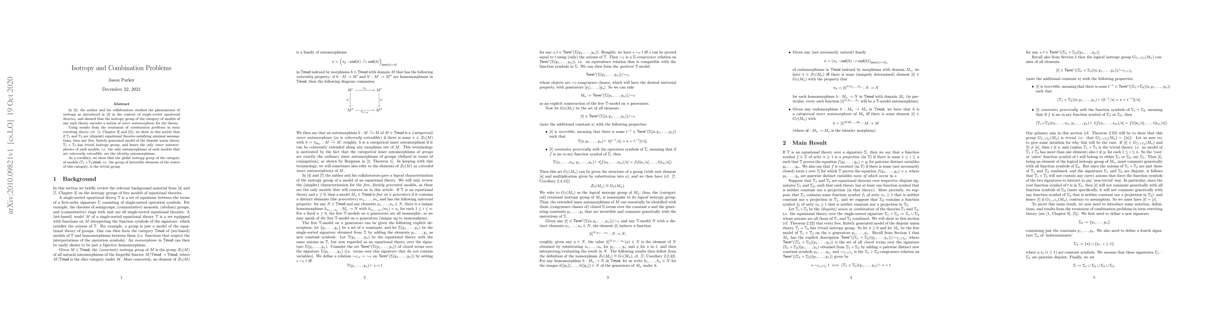 In a previous paper, the author and his collaborators studied the phenomenon of isotropy in the context of single-sorted equational theories, and showed that the isotropy group of the category of models of any such theory encodes a notion of inner automorphism for the theory. Using results from the treatment of combination problems in term rewriting theory, we show in this article that if $\mathbb{T}_1$ and $\mathbb{T}_2$ are (disjoint) equational theories satisfying minimal assumptions, then any free, finitely generated model of the disjoint union theory $\mathbb{T}_1 + \mathbb{T}_2$ has trivial isotropy group, and hence the only inner automorphisms of such models, i.e. the only automorphisms of such models that are coherently extendible, are the identity automorphisms. As a corollary, we show that the global isotropy group of the category of models $(\mathbb{T}_1 + \mathbb{T}_2)\mathsf{mod}$, i.e. the group of invertible elements of the centre of this category, is the trivial group.