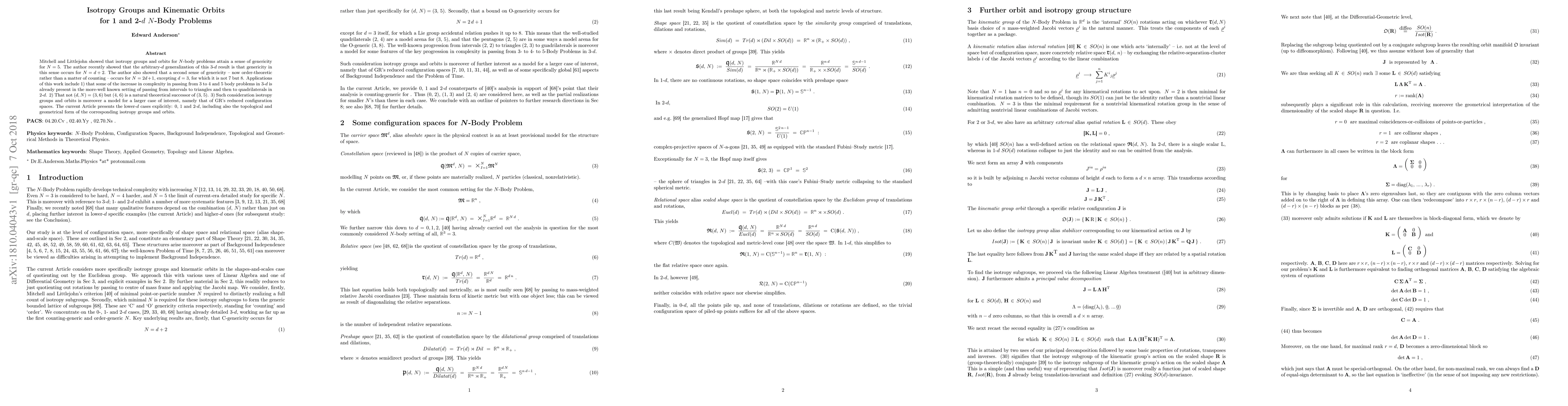 The paper explores isotropy groups and kinematic orbits in N-body problems, demonstrating genericity for N=5 in 3D and N=d+2 in arbitrary dimensions. It also identifies a second sense of genericity for N=2d+1, except d=3. The findings suggest increased complexity from 3 to 4/5 bodies in 3D mirrors moving from intervals to quadrilaterals in 2D, and propose (4,6) as the 3D-(3,5) successor. The research models reduced configuration spaces in General Relativity, presenting 0D, 1D, and 2D cases with topological and geometrical descriptions of isotropy groups and orbits.