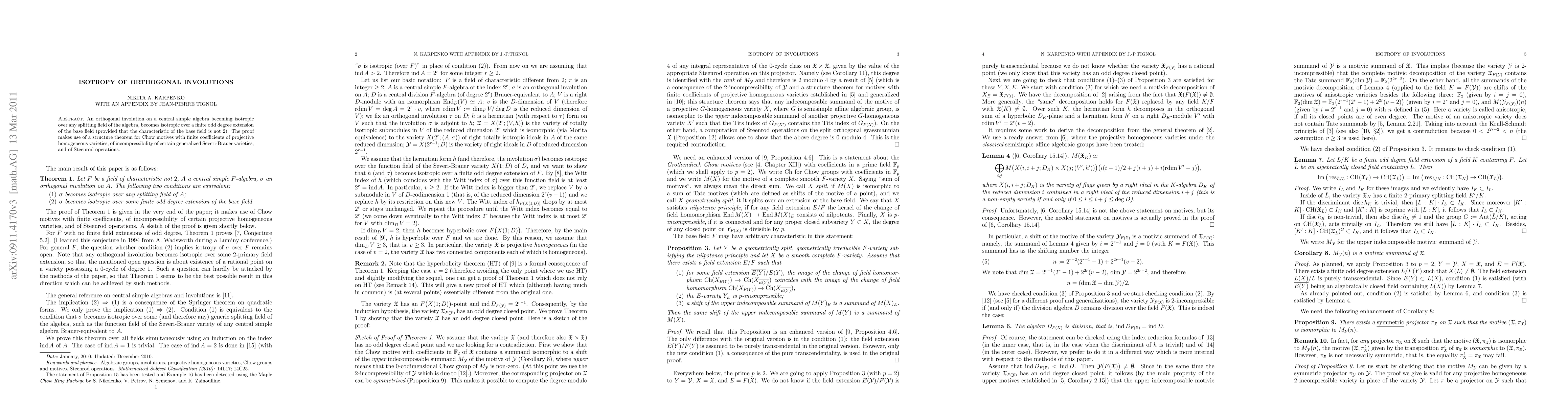 A research paper proves that if an orthogonal involution on a central simple algebra becomes isotropic over a splitting field, it also becomes isotropic over a finite odd degree extension of the base field. The proof uses advanced mathematical concepts such as Chow motives and Steenrod operations.