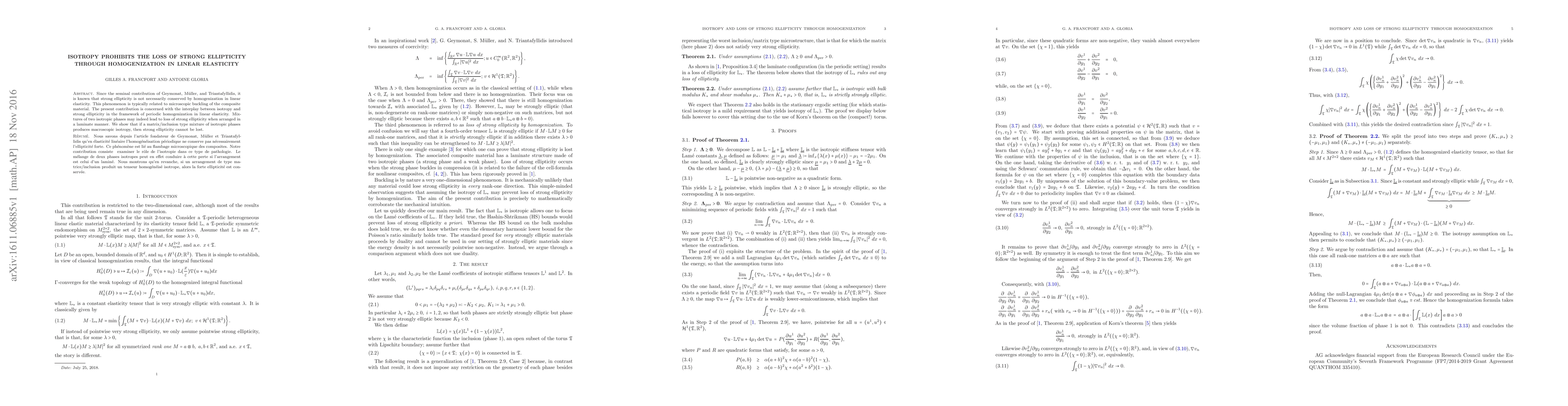 Since the seminal contribution of Geymonat, M{\"u}ller, and Triantafyllidis, it is known that strong ellipticity is not necessarily conserved by homogenization in linear elasticity. This phenomenon is typically related to microscopic buckling of the composite material. The present contribution is concerned with the interplay between isotropy and strong ellipticity in the framework of periodic homogenization in linear elasticity. Mixtures of two isotropic phases may indeed lead to loss of strong ellipticity when arranged in a laminate manner. We show that if a matrix/inclusion type mixture of isotropic phases produces macroscopic isotropy, then strong ellipticity cannot be lost. R{\'e}sum{\'e}. Nous savons depuis l'article fondateur de Geymonat, M{\"u}ller et Triantafyl-lidis qu'en{\'e}lasticit{\'e}en{\'e}lasticit{\'e} lin{\'e}aire l'homog{\'e}n{\'e}isation p{\'e}riodique ne conserve pas n{\'e}cessairement l'ellipticit{\'e} forte. Ce ph{\'e}nom{\`e}ne est li{\'e} au flambage microscopique des composites. Notre contribution consiste examiner le r{\^o}le de l'isotropie dans ce type de pathologie. Le m{\'e}lange de deux phases isotropes peut en effet conduir{\`e} a cette perte si l'arrangement est celui d'un lamin{\'e}. Nous montrons qu'en revanche, si un arrangement de type ma-trice/inclusion produit un tenseur homog{\'e}n{\'e}is{\'e} isotrope, alors la forte ellipticit{\'e} est con-serv{\'e}e.