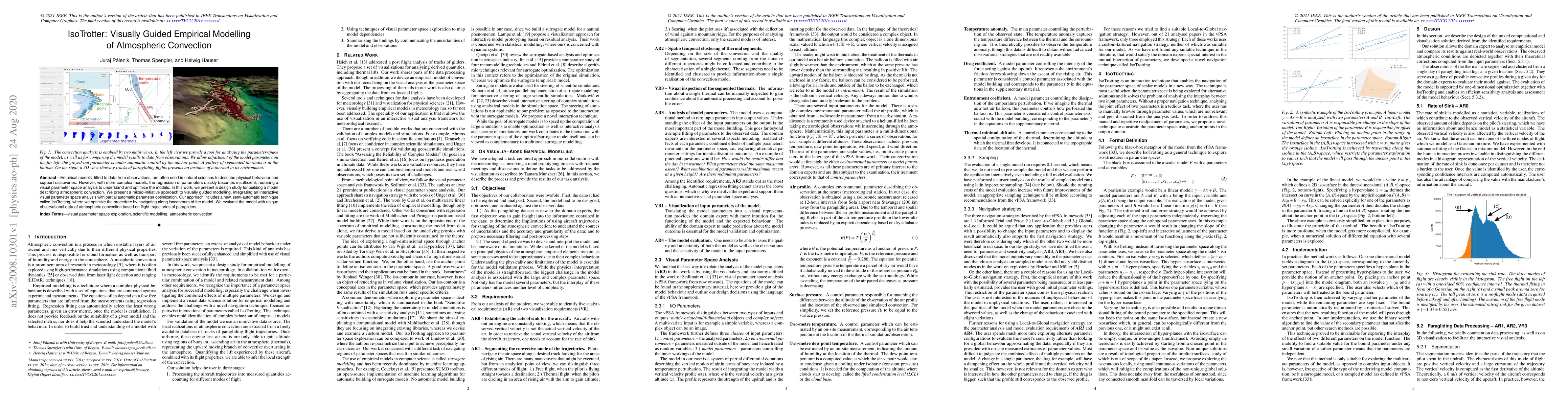 Empirical models, fitted to data from observations, are often used in natural sciences to describe physical behaviour and support discoveries. However, with more complex models, the regression of parameters quickly becomes insufficient, requiring a visual parameter space analysis to understand and optimize the models. In this work, we present a design study for building a model describing atmospheric convection. We present a mixed-initiative approach to visually guided modelling, integrating an interactive visual parameter space analysis with partial automatic parameter optimization. Our approach includes a new, semi-automatic technique called IsoTrotting where we optimize the procedure by navigating along isocontours of the model. We evaluate the model with unique observational data of atmospheric convection based on flight trajectories of paragliders.