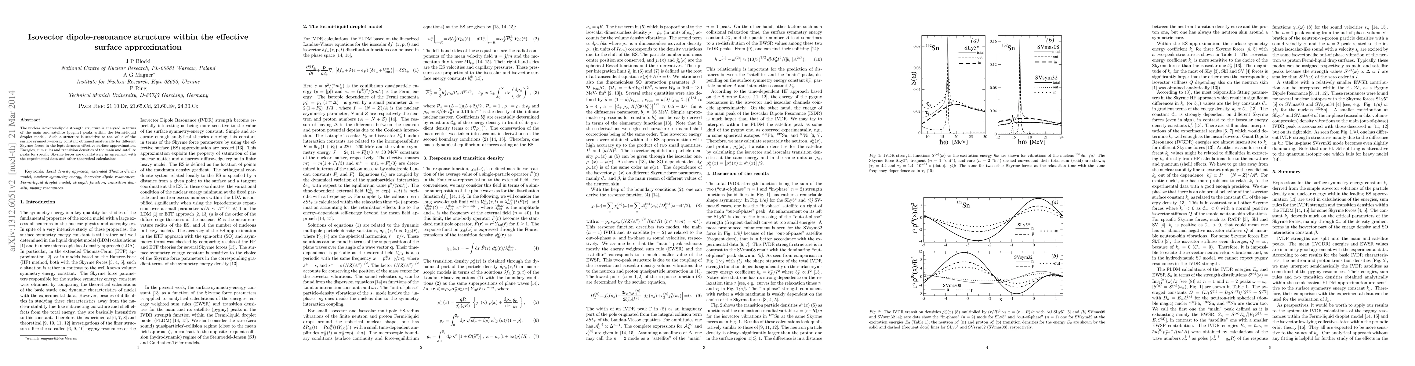 The nuclear isovector-dipole strength structure is analyzed in terms of the main and satellite (pygmy) peaks within the Fermi-liquid droplet model. Such a structure is sensitive to the value of the surface symmetry-energy constant obtained analytically for different Skyrme forces in the leptodermous effective surface approximation. Energies, sum rules and transition densities of the main and satellite peaks for specific Skyrme forces are qualitatively in agreement with the experimental data and other theoretical calculations.