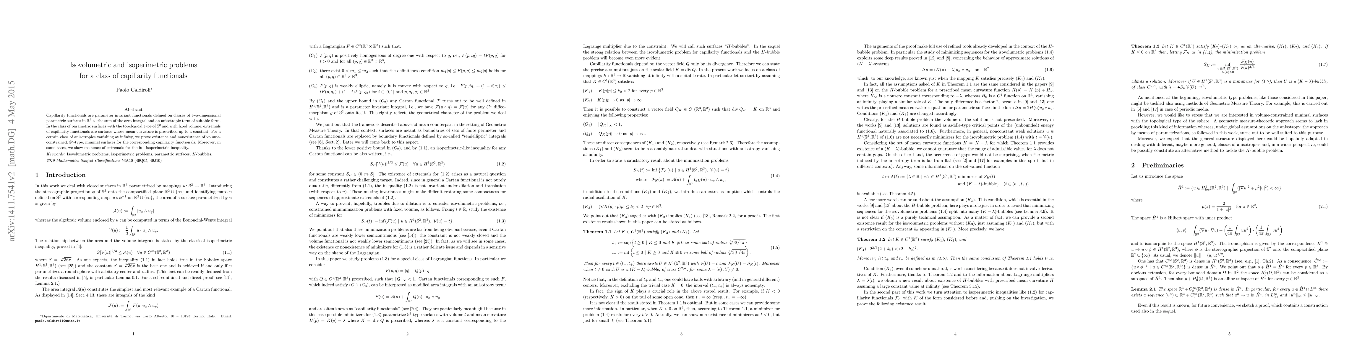Capillarity functionals are parameter invariant functionals defined on classes of two-dimensionals parametric surfaces in R3 as the sum of the area integral with an anisotropic term of suitable form. In the class of parametric surfaces with the topological type of S2 and with fixed volume, extremals of capillarity functionals are surfaces whose mean curvature is prescribed up to a constant. For a certain class of anisotropies vanishing at infinity, we prove existence and nonexistence of volume- constrained, S2-type, minimal surfaces for the corresponding capillarity functionals. Moreover, in some cases, we show existence of extremals for the full isoperimetric inequality.