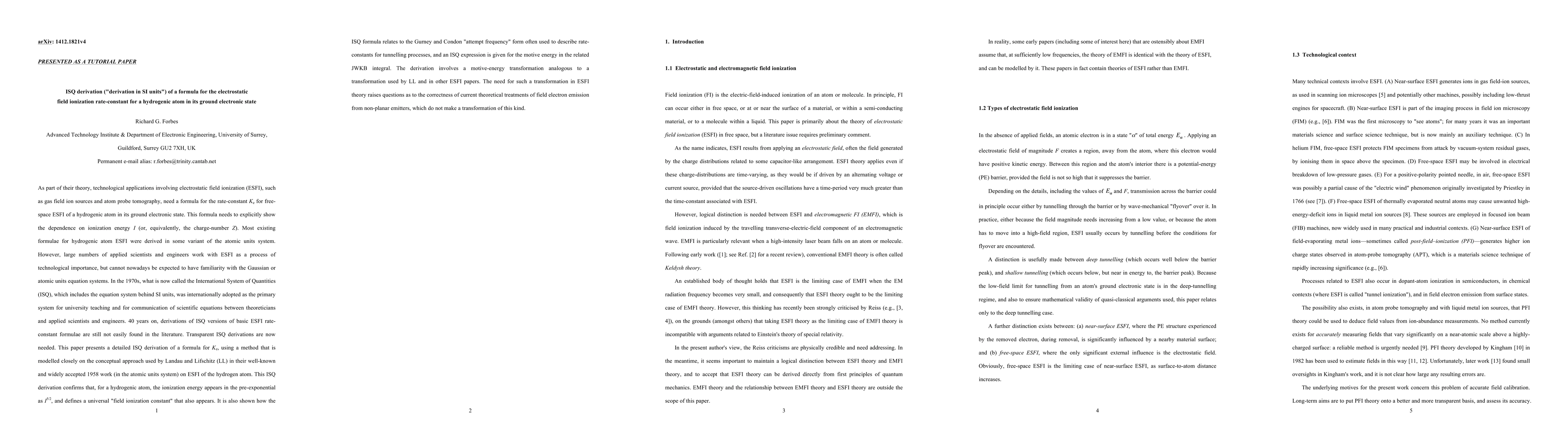 Technical applications using electrostatic field ionization (ESFI) need a formula for the rate-constant K_e for the free-space ESFI of a hydrogenic atom in its ground electronic state. This formula must indicate the dependence on ionization energy I. Existing formulae were derived using atomic units. However, many scientists work with ESFI as an important technical process, but are not familiar with the Gaussian or atomic units systems. In the 1970s, the present International System of Quantities (ISQ), which includes the equations behind SI units, was designated as the main system for university teaching and the communication of scientific equations. 40 years on, ISQ derivations of ESFI rate-constant formulae are still not easily found, but are now needed. This tutorial paper gives a detailed ISQ derivation of a formula for K_e. The derivation is closely modelled on the Landau and Lifshitz (LL) approach used in their 1958 work (in atomic units) on hydrogen atom ESFI. The ISQ derivation confirms that, for hydrogenic atoms, ionization energy appears in the pre-exponential as I^(5/2), and defines a universal "field ionization constant". It also shows how the ISQ formula relates to the Gurney and Condon "attempt frequency" form for tunnelling rate-constants, and an ISQ formula is given for the motive energy in the related JWKB integral. The ISQ derivation uses a motive-energy transformation analogous to a transformation used by LL. The need for this transformation in ESFI theory raises questions as to the correctness of theoretical treatments of field electron emission from non-planar emitters, which do not make this transformation.