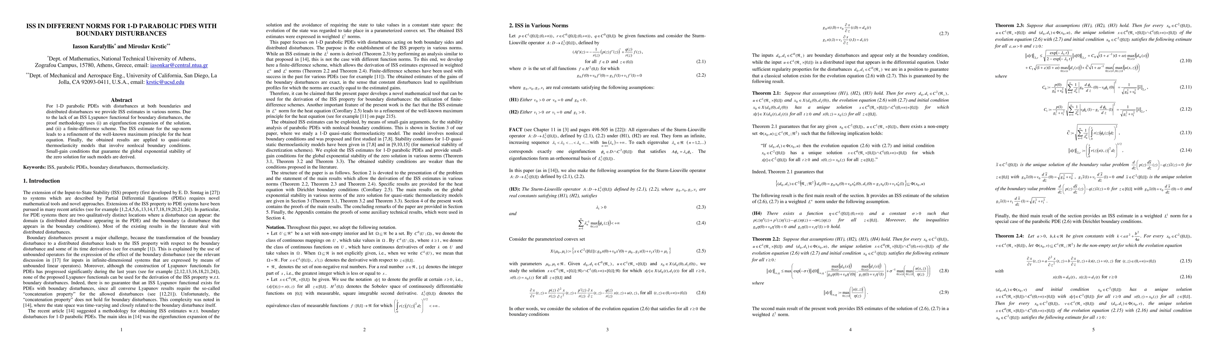 This paper provides Input-to-State Stability (ISS) estimates for 1-D parabolic PDEs with boundary and distributed disturbances, utilizing eigenfunction expansion and finite-difference schemes. The results refine the maximum principle for the heat equation and are applied to quasi-static thermoelasticity models with nonlocal boundary conditions, deriving small-gain conditions for global exponential stability.