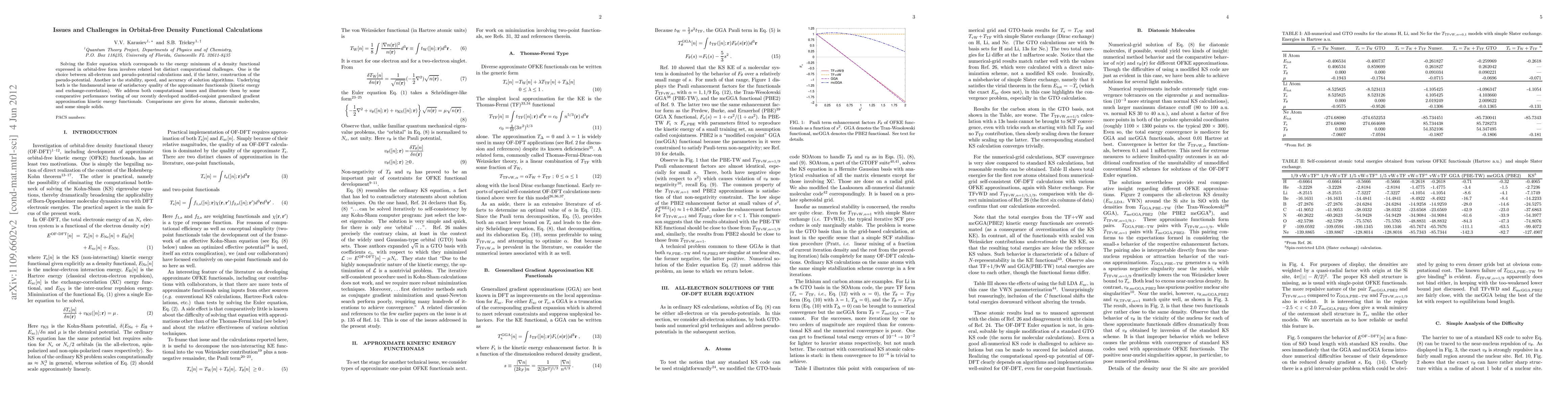 This paper discusses the computational challenges in orbital-free density functional calculations, focusing on the choice between all-electron and pseudo-potential methods, the stability and accuracy of solution algorithms, and the quality of approximate functionals. It presents comparative performance testing of newly developed kinetic energy functionals for various atomic and molecular systems.