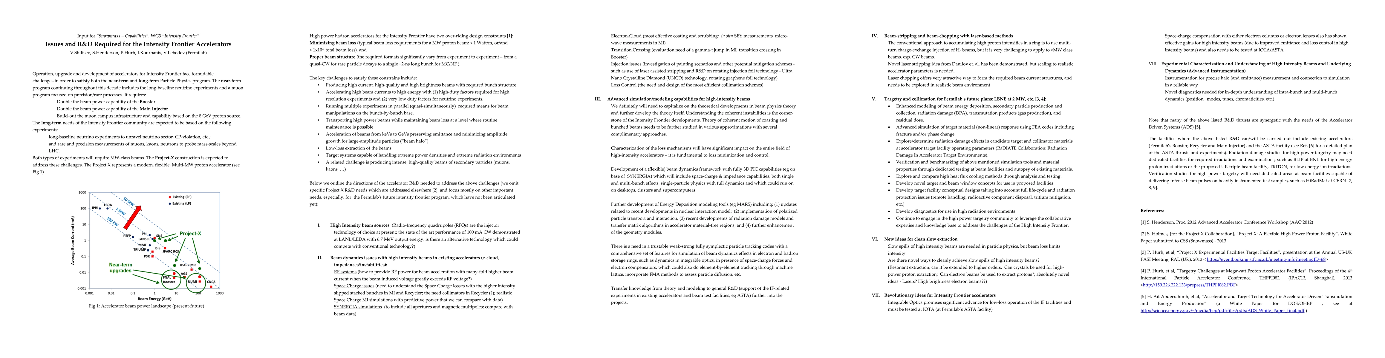 This paper identifies key challenges and necessary research and development for the next generation of high-intensity frontier accelerators, aiming to inform the 2013 APS/DPF Community Summer Study (Snowmass-2013). It outlines potential technical hurdles and proposes areas for future innovation.