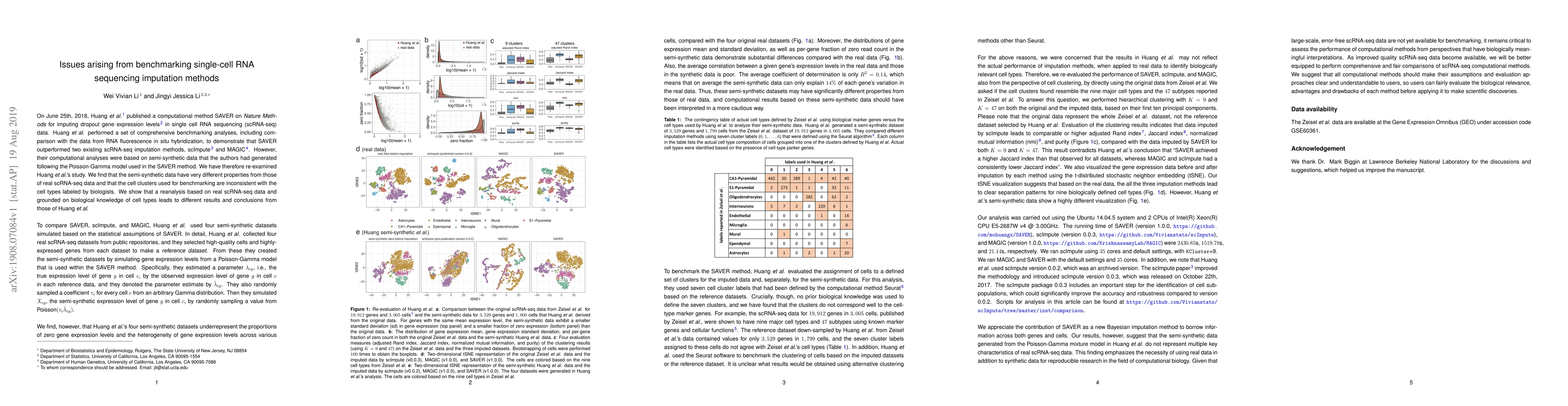 On June 25th, 2018, Huang et al. published a computational method SAVER on Nature Methods for imputing dropout gene expression levels in single cell RNA sequencing (scRNA-seq) data. Huang et al. performed a set of comprehensive benchmarking analyses, including comparison with the data from RNA fluorescence in situ hybridization, to demonstrate that SAVER outperformed two existing scRNA-seq imputation methods, scImpute and MAGIC. However, their computational analyses were based on semi-synthetic data that the authors had generated following the Poisson-Gamma model used in the SAVER method. We have therefore re-examined Huang et al.'s study. We find that the semi-synthetic data have very different properties from those of real scRNA-seq data and that the cell clusters used for benchmarking are inconsistent with the cell types labeled by biologists. We show that a reanalysis based on real scRNA-seq data and grounded on biological knowledge of cell types leads to different results and conclusions from those of Huang et al.