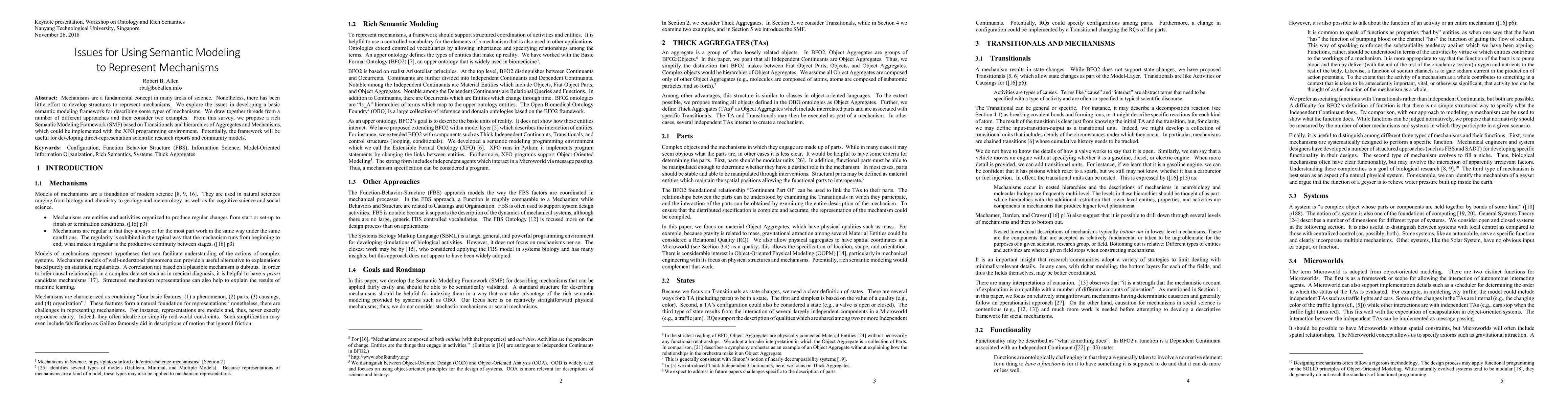 Mechanisms are a fundamental concept in many areas of science. Nonetheless, there has been little effort to develop structures to represent mechanisms. We explore the issues in developing a basic semantic modeling framework for describing some types of mechanisms. We draw together threads from a number of different approaches and then consider two examples. From this survey, we propose a rich Semantic Modeling Framework (SMF) based on Transitionals and hierarchies of Aggregates and Mechanisms, which could be implemented with the XFO programming environment. Potentially, the framework will be useful for developing direct-representation scientific research reports and community models.