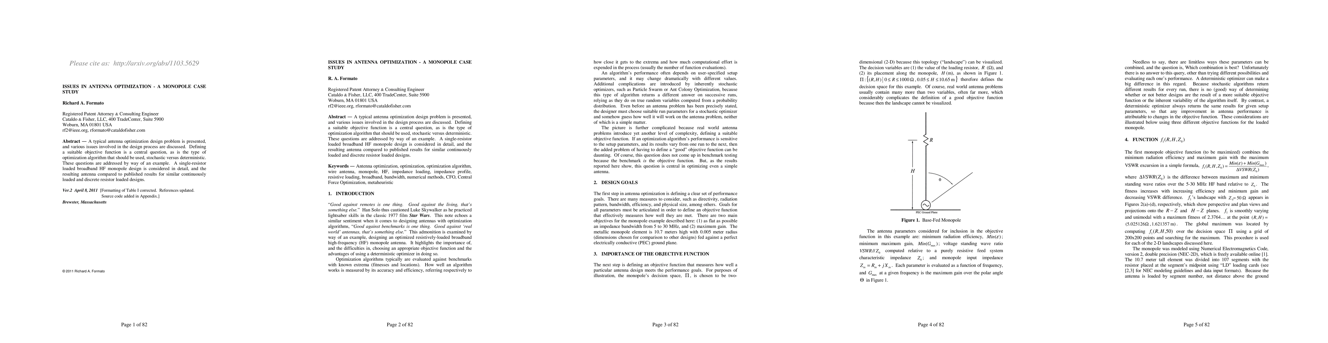 A typical antenna optimization design problem is presented, and various issues involved in the design process are discussed. Defining a suitable objective function is a central question, as is the type of optimization algorithm that should be used, stochastic versus deterministic. These questions are addressed by way of an example. A single-resistor loaded broadband HF monopole design is considered in detail, and the resulting antenna compared to published results for similar continuously loaded and discrete resistor loaded designs.