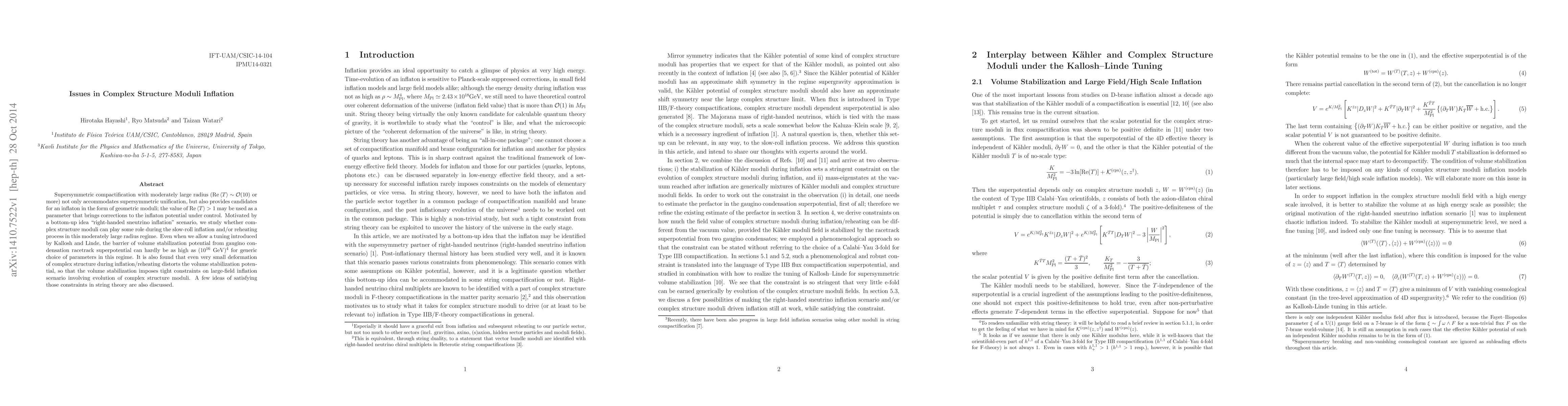 Supersymmetric compactification with moderately large radius (${\rm Re}< T > \sim {\cal O}(10)$ or more) not only accommodates supersymmetric unification, but also provides candidates for an inflaton in the form of geometric moduli; the value of ${\rm Re}< T > > 1$ may be used as a parameter that brings corrections to the inflaton potential under control. Motivated by a bottom-up idea "right-handed sneutrino inflation" scenario, we study whether complex structure moduli can play some role during the slow-roll inflation and/or reheating process in this moderately large radius regime. Even when we allow a tuning introduced by Kallosh and Linde, the barrier of volume stabilization potential from gaugino condensation racetrack superpotential can hardly be as high as $(10^{16} \; {\rm GeV})^4$ for generic choice of parameters in this regime. It is also found that even very small deformation of complex structure during inflation/reheating distorts the volume stabilization potential, so that the volume stabilization imposes tight constraints on large-field inflation scenario involving evolution of complex structure moduli. A few ideas of satisfying those constraints in string theory are also discussed.